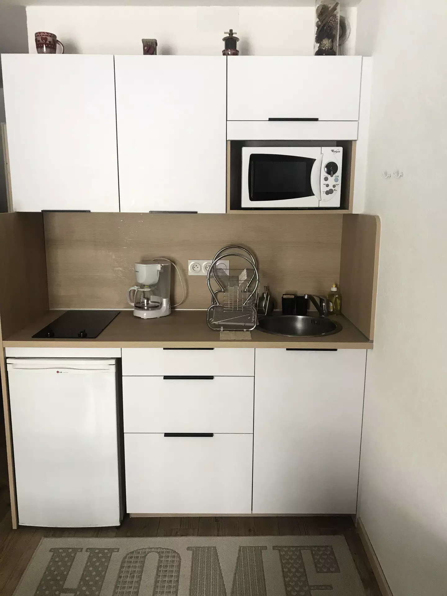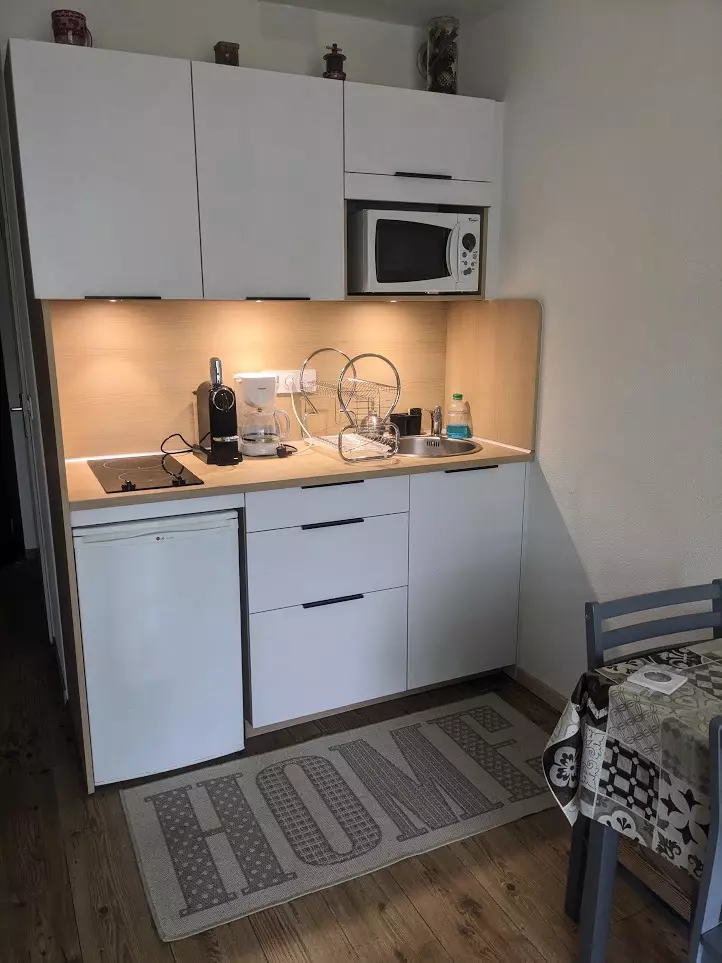 Coin cuisine équipée avec plaques électriques, réfrigérateur,four micro-ondes, cafetière à filtre, bouilloire, nécessaire de vaisselle.