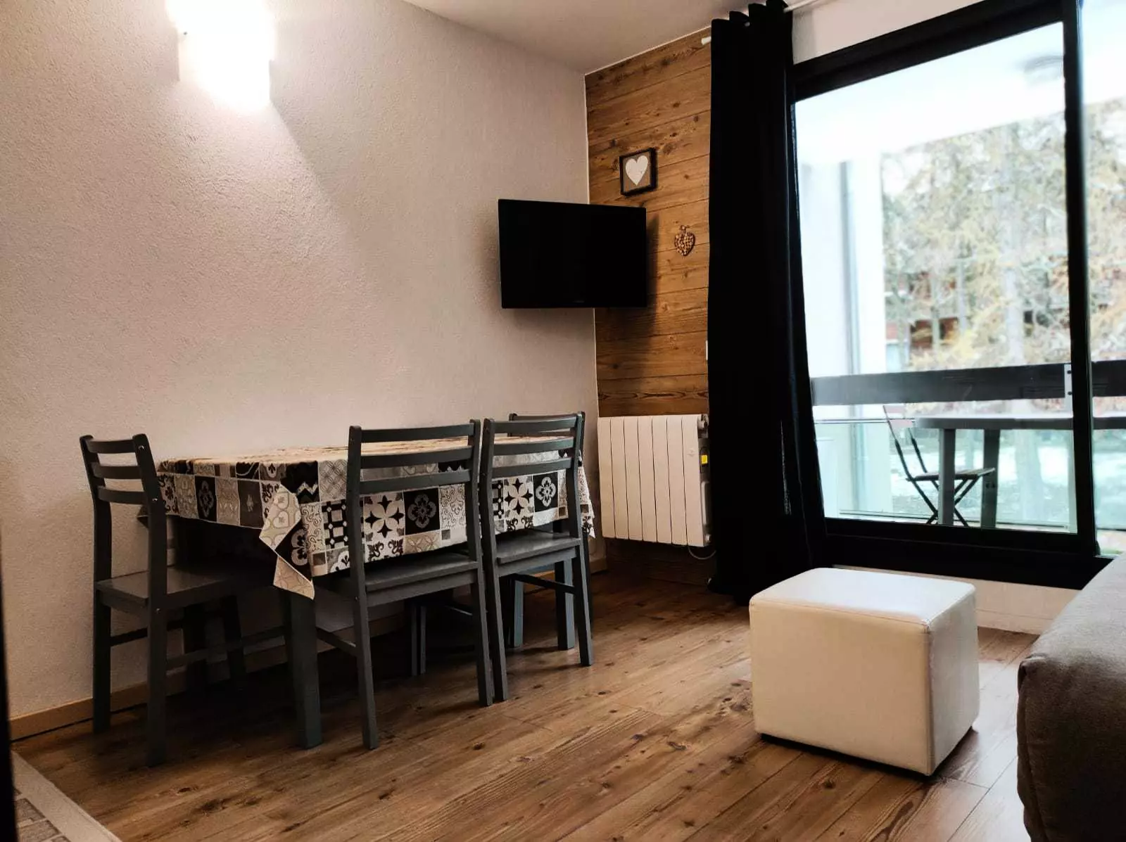 Pièce à vivre avec télévision, canapé-lit ,coin repas.