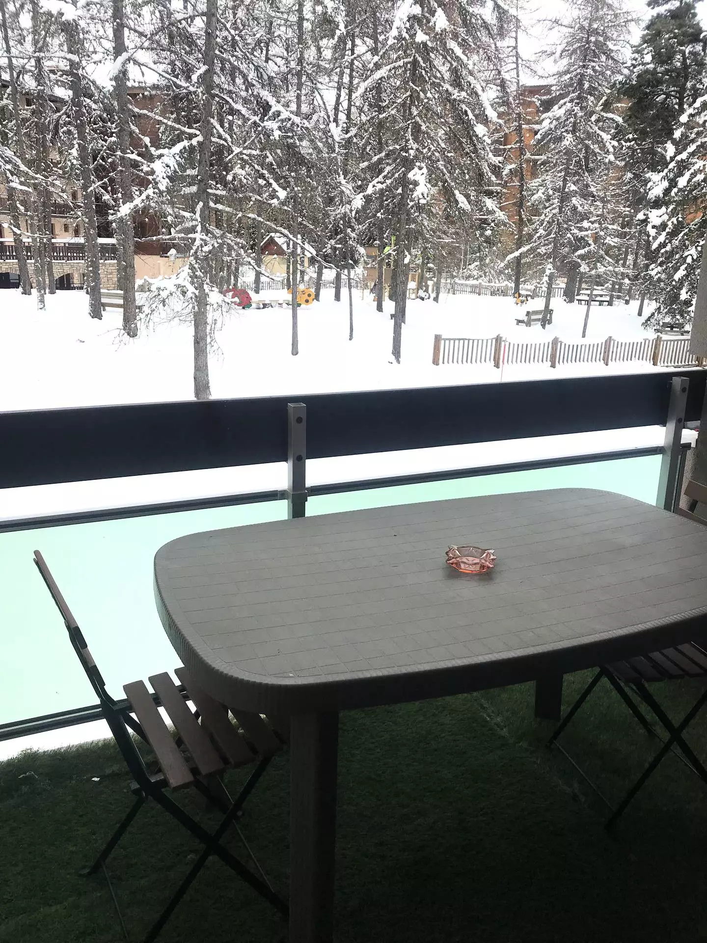 Grand balcon avec vue sur front de neige. Local à skis.