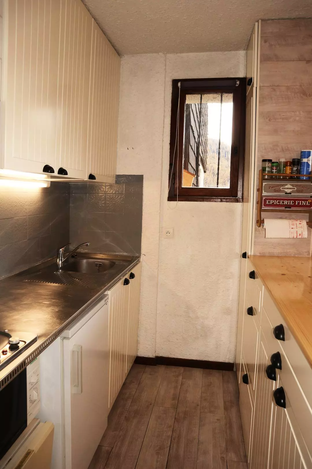 Petite Résidence au calme dans quartier de Prébois, au coeur des mélèzes, à 100 mètres du télésiège et à 400 mètres du centre station et des commerces, studio équipé pour 4 personnes comprenant une entrée avec 2 lits superposés 1 place, un séjour avec 1 banquette convertible 2 places, un coin cuisine ouvert sur le séjour, une salle de bains avec WC. Balcon exposition Ouest vue sur la vallée. Box à skis.