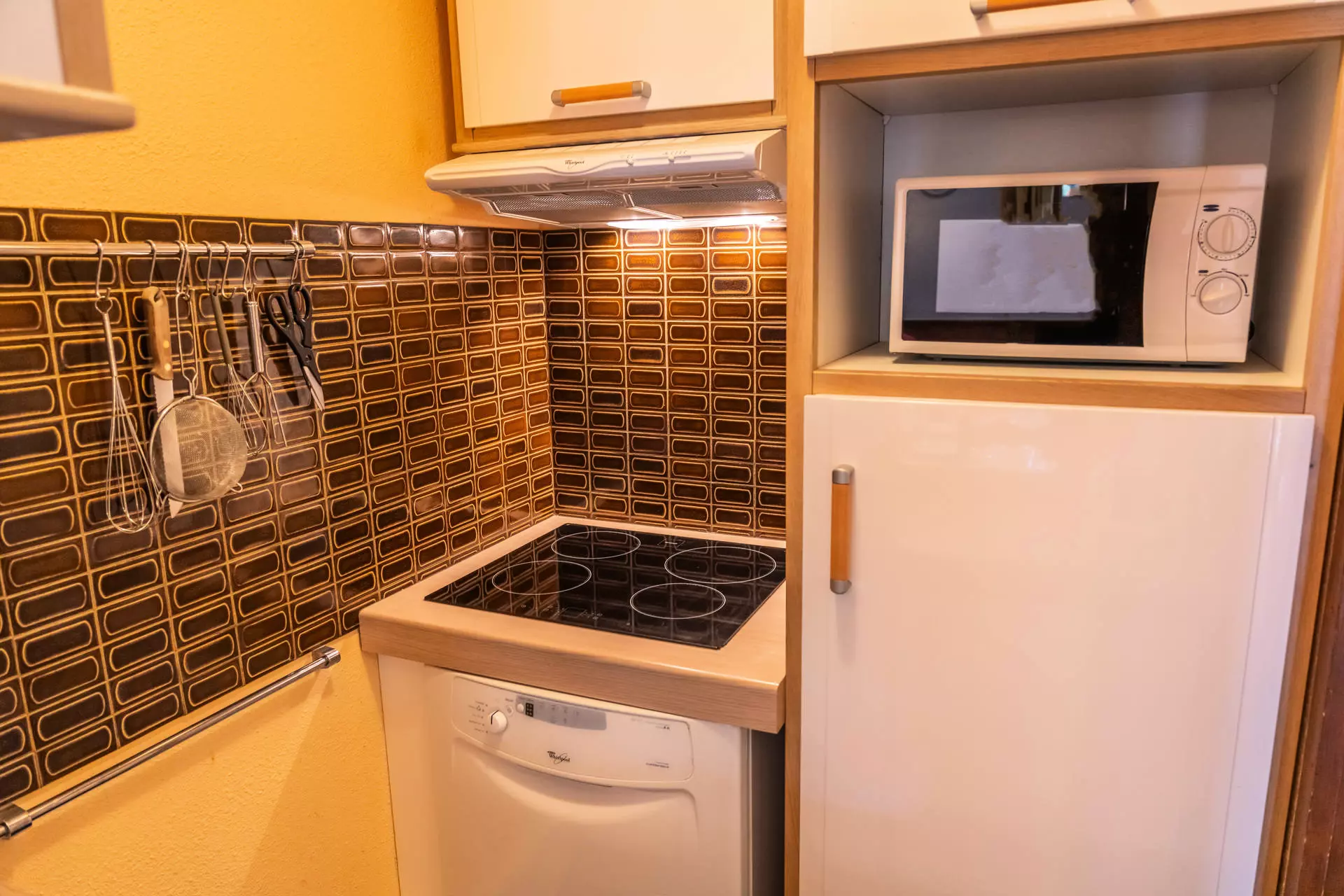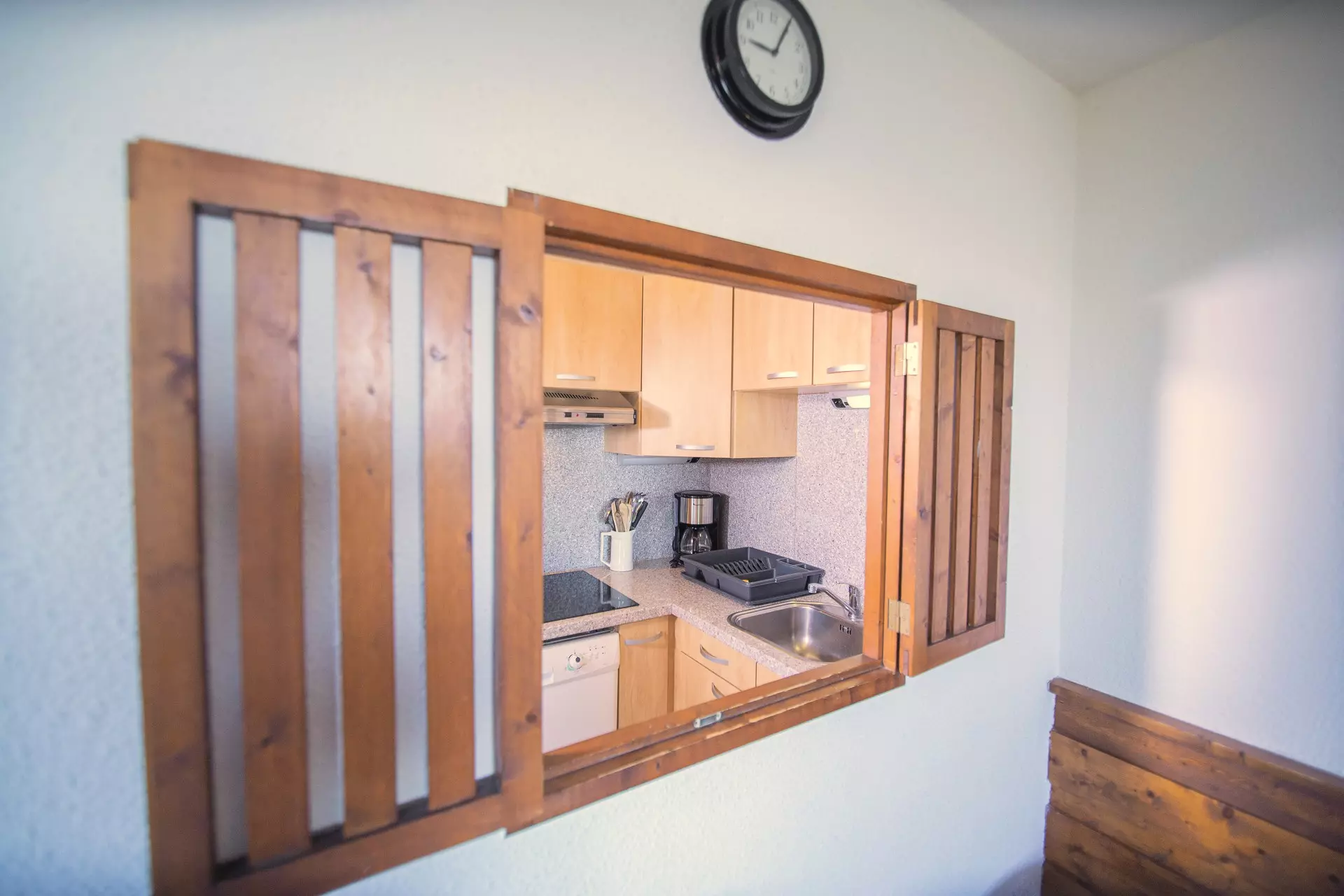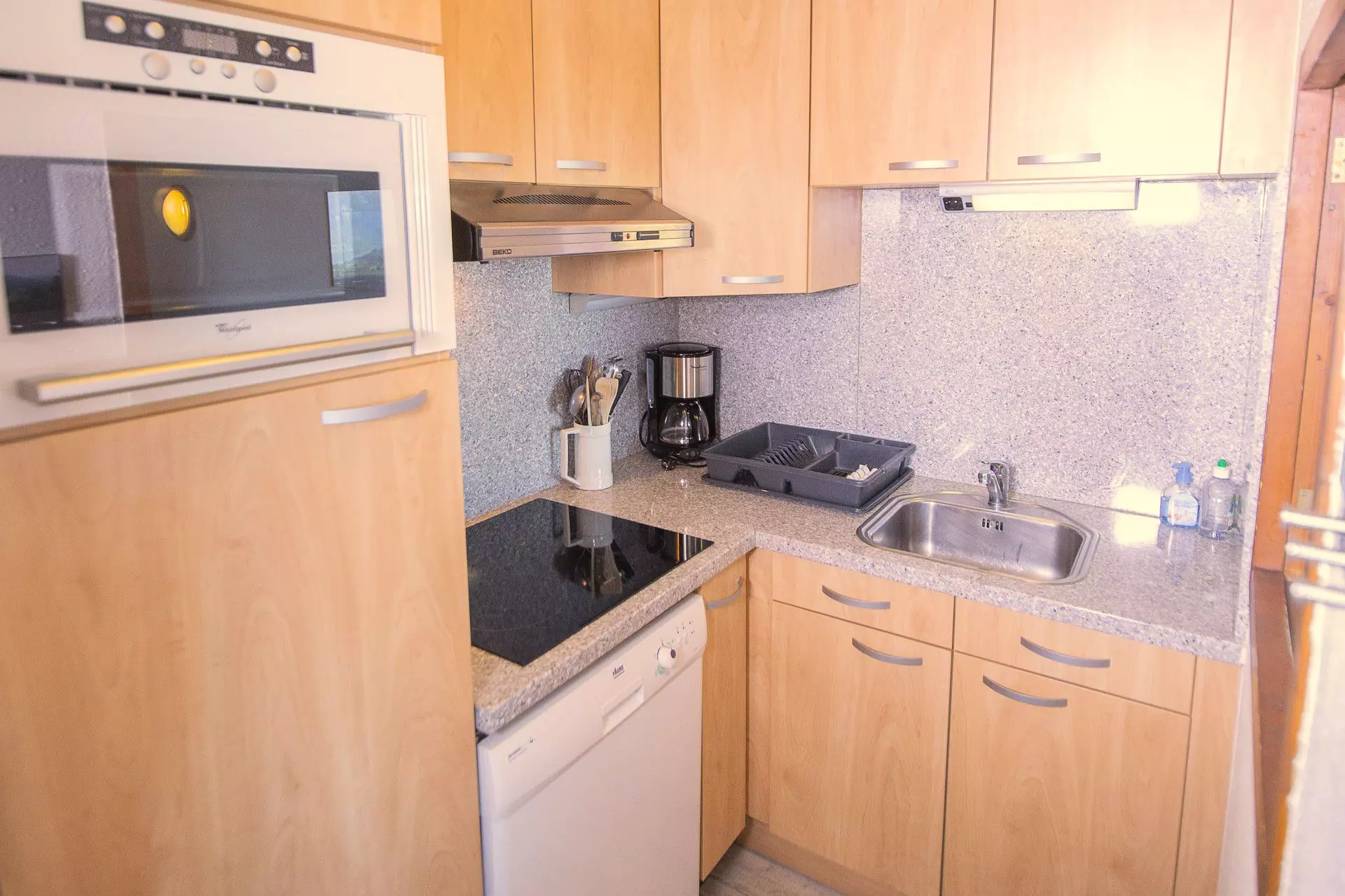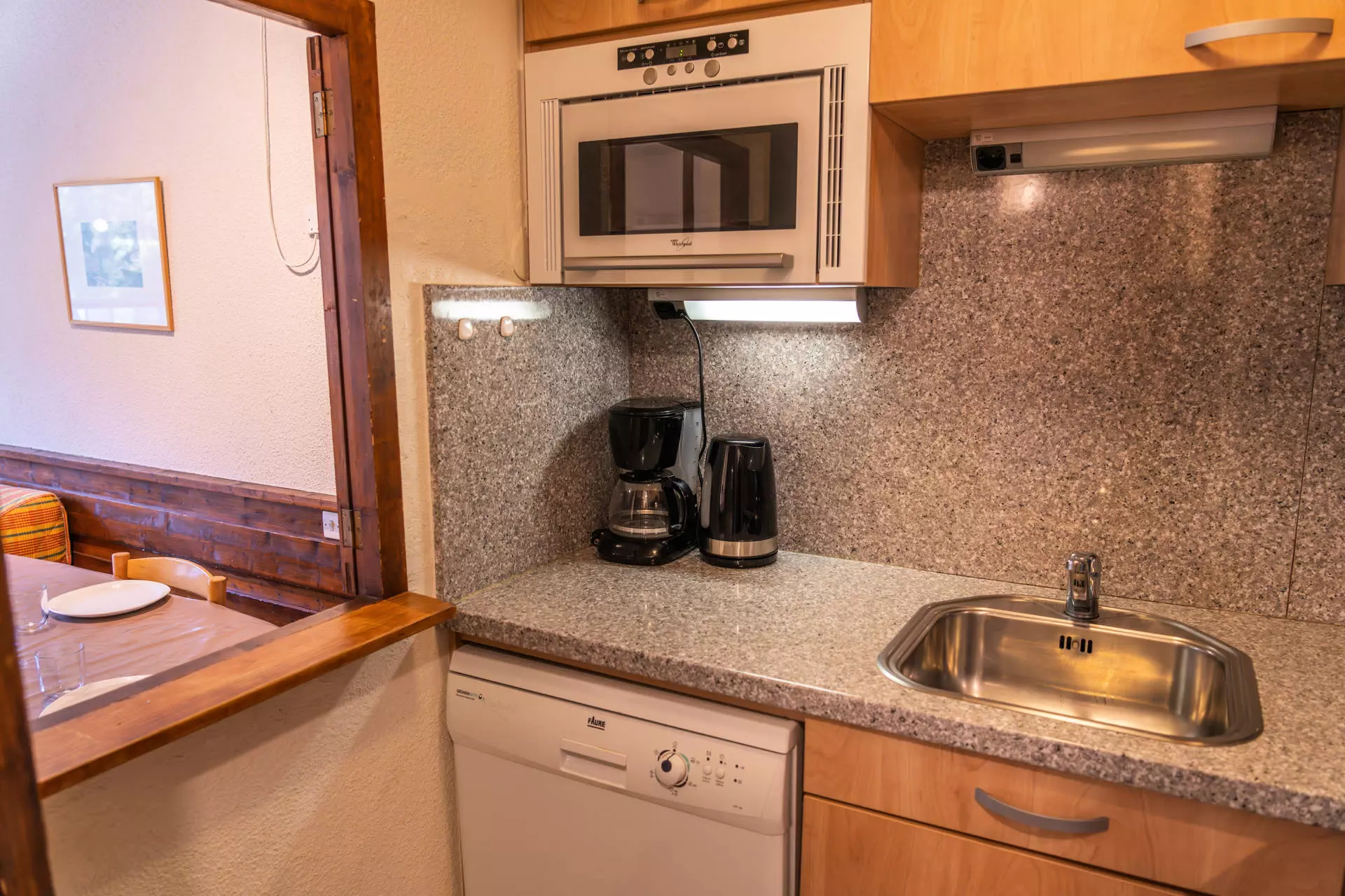 La cuisine équipée d'un lave-vaisselle, micro-ondes grill et d'un appareil à raclette vous permettra de passer des soirées conviviales en famille ou entre amis.