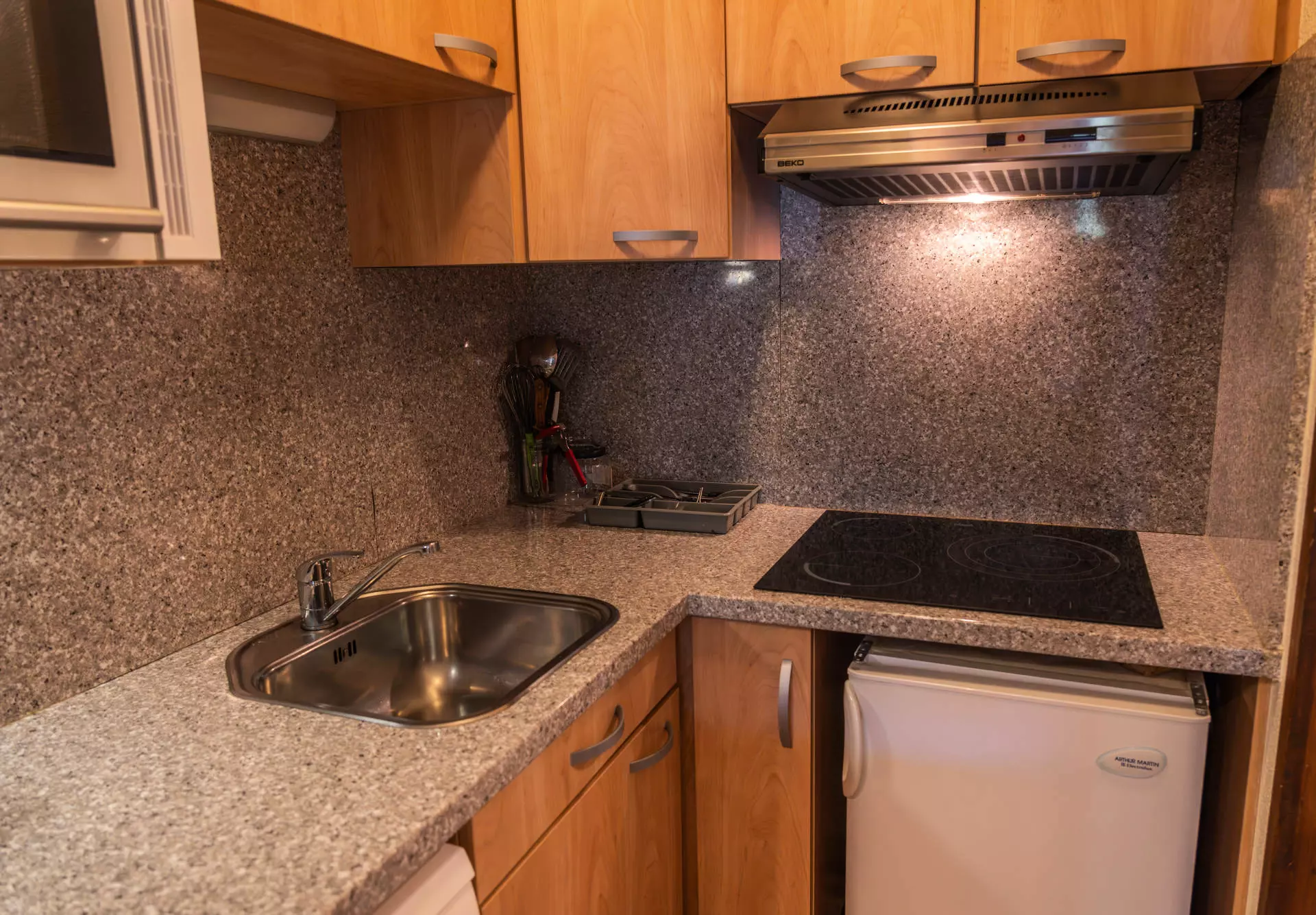 La kitchenette est équipée avec le nécessaire pour la cuisine, un micro-ondes grill, un grille pain, une bouilloire, une cafetière à filtre...