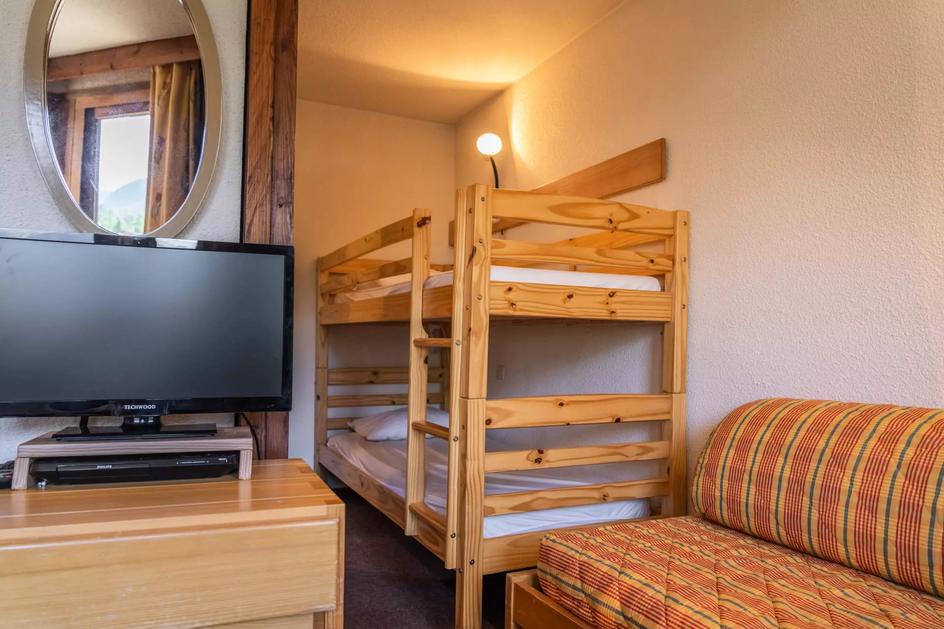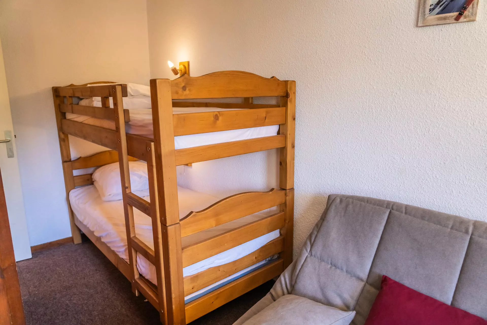 Côté couchage, vous pourrez choisir entre le coin montagne avec lits superposés en 80*190cm, une chambre avec 2 lits jumeaux 80*190cm, et un canapé lit gigogne 2 personnes 2 x 80*190cm dans la pièce à vivre.