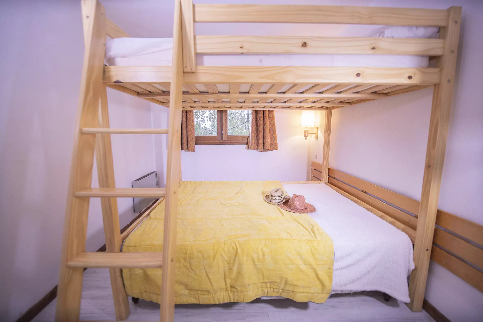 Côté couchage, vous pourrez choisir entre la chambre avec des lits superposés doubles en 140*190cm, et un canapé lit gigogne 2 personnes 2x80*190cm dans la pièce à vivre.