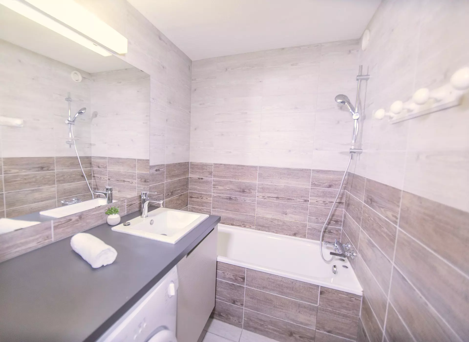 La salle de bain également rénovée dispose d'une baignoire, pour un moment relaxant après vos activités favorites, mais également d'un lave linge et d'un sèche cheveux pour plus de confort.