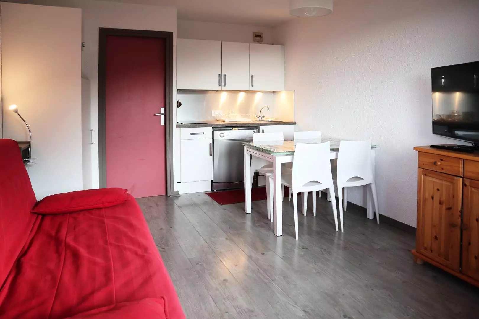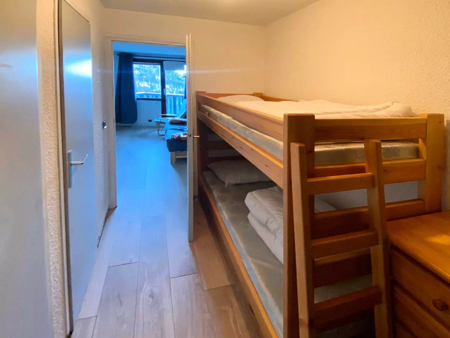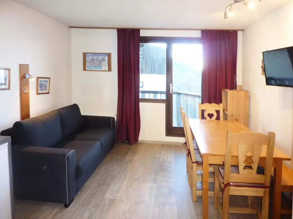 Joli studio équipé pour 4 personnes composé d'une entrée avec 2 lits superposés 1 places d'un séjour avec 1 banquette bz 2 place offrant une très belle vue pistes.