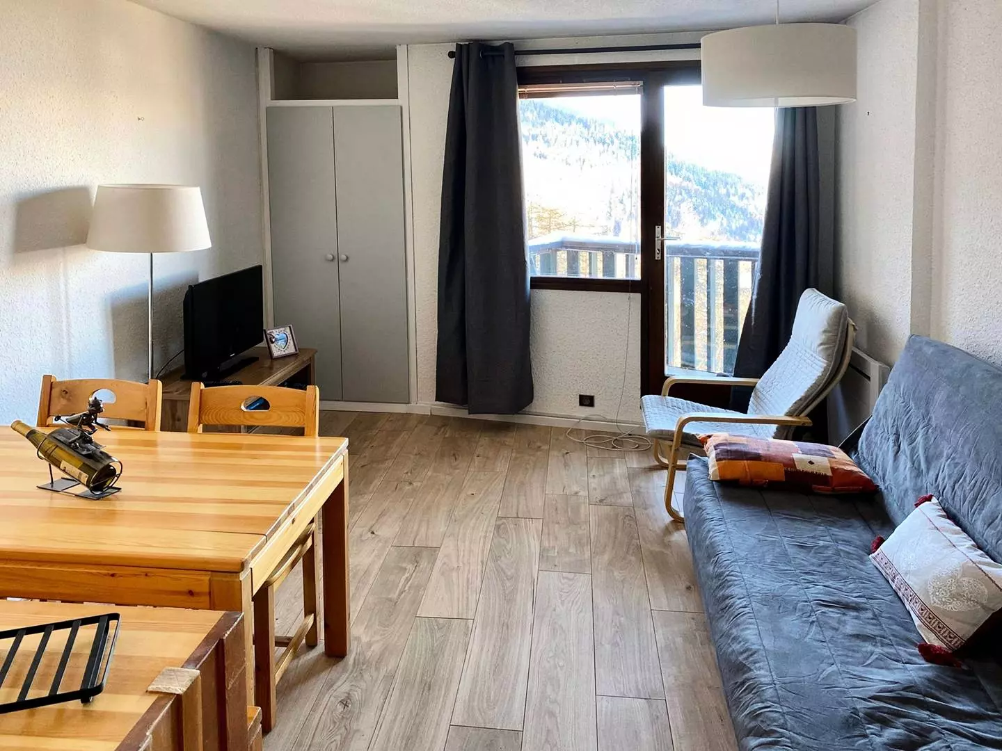 Grand studio , équipé pour 6 personnes composé d'une entrée avec 2 x 2 lits superposés 1 place d'un séjour avec 1 banquette convertible 2 places, salle de bain et wc indépendants, coin cuisine ouvert sur le séjour, balcon exposé Ouest avec vue sur la vallée.