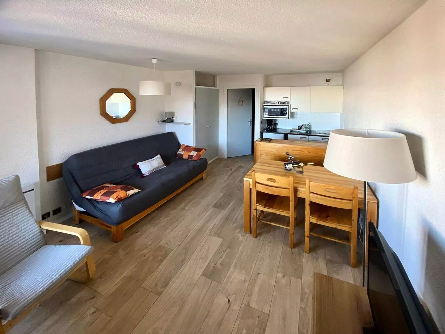 Studio équipé pour 6 personnes composé d'une entrée avec 2x 2 lits superposés 1 place d'un séjour avec 1 banquette convertible 2 places, salle de bains et wc séparés, coin cuisine ouvert sur le séjour, balcon exposé sud offrant une vue montagne