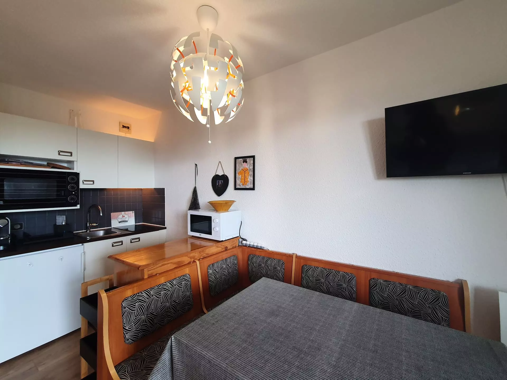 Vous y trouverez une cuisine toute équipée (cafetière Dolce Gusto, appareil à raclette multifonction, grille pain, bouilloire, mini-four) ouverte sur le salon fraiîchement rénové qui vous permettra de passer des moments conviviaux.