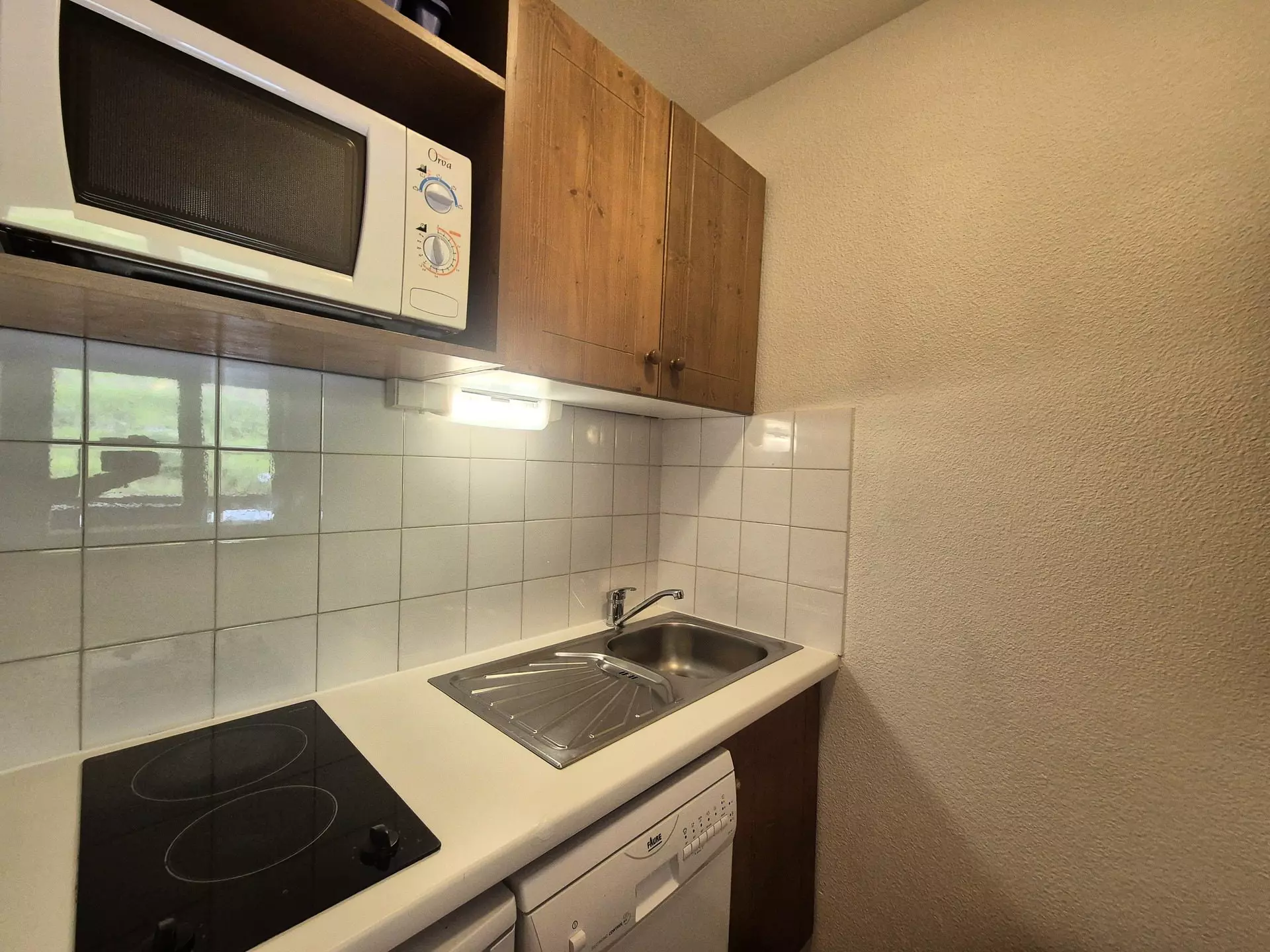 Coin cuisine équipé avec un micro ondes, plaques de cuisson et lave-vaisselle
