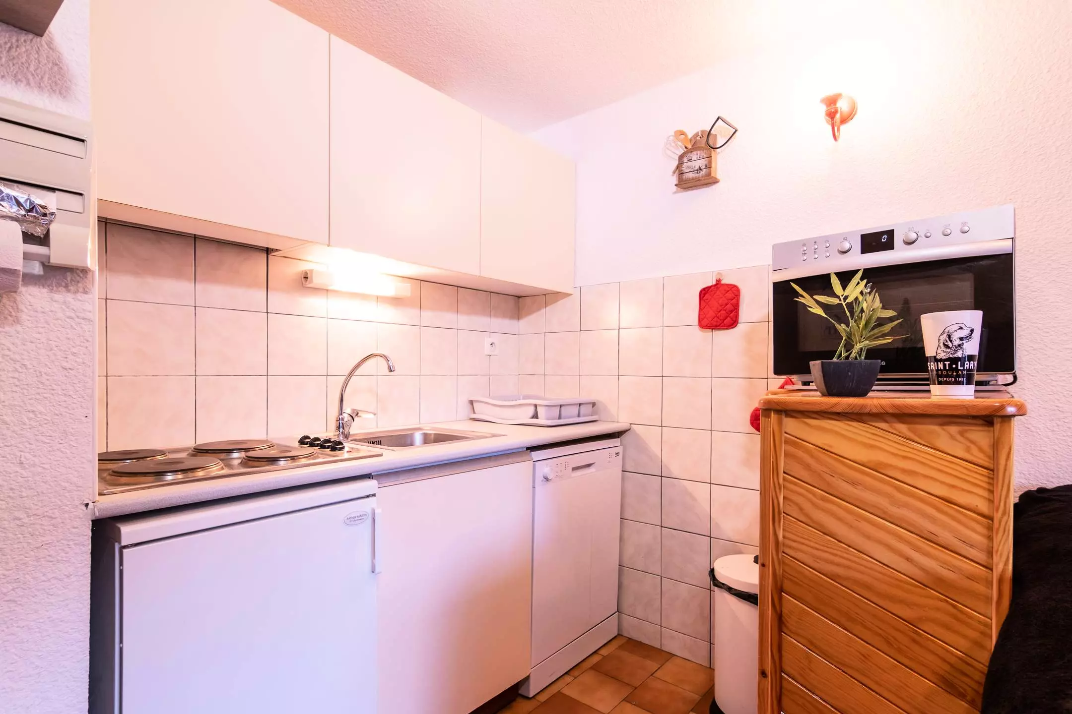 D'une Kitchenette équipée ouverte sur le séjour ( plaques électrique 4 feux, four électrique+ micro-ondes+lave-linge)