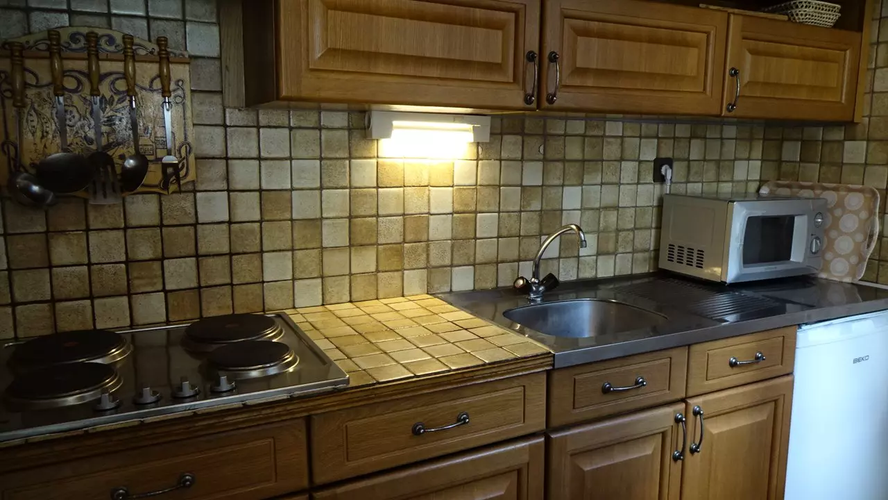 La pièce principale exposée Sud Est se compose d'un séjour lumineux avec un canapé clic-clac et coin repas donnant sur une terrasse exposée sud avec salon de jardin, une cuisine séparée équipée, d'un frigo, plaque électrique et d'un micro-ondes, fenêtre donnant sur l'extérieur.