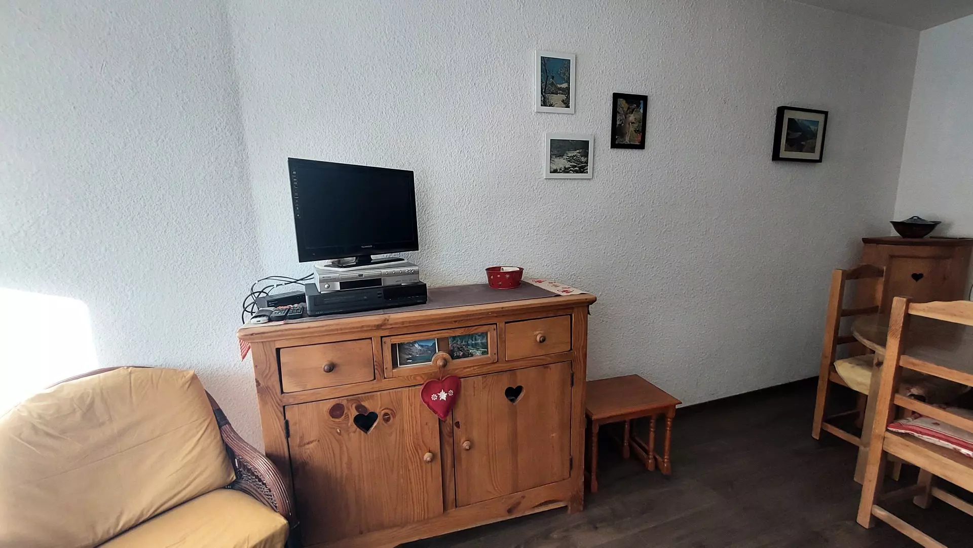 Pièce à vivre: séjour avec télévision, canapé et coin repas.