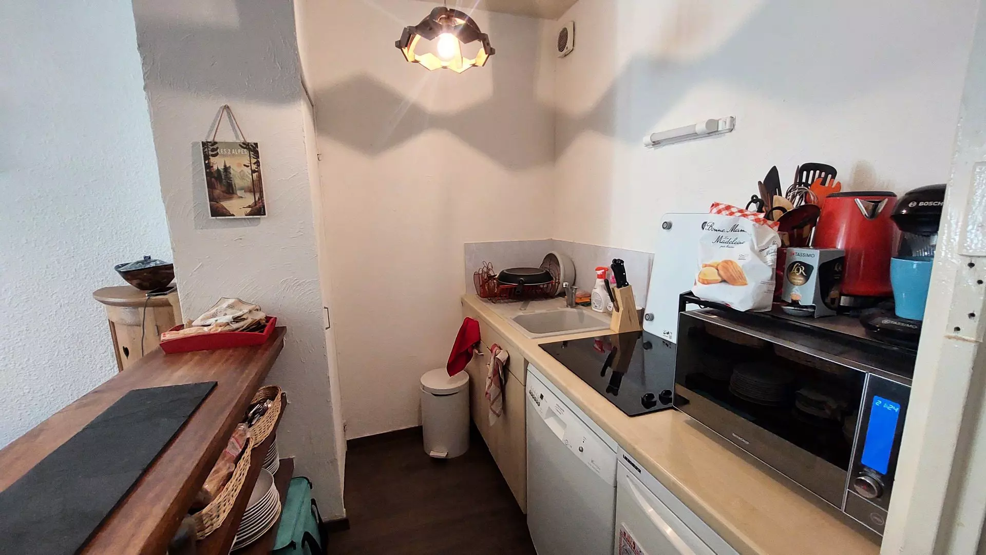 Equipements: 2 plaque vitrocéramiques, micro-onde, réfrigérateur, congélateur, four, cafetière, bouilloire, grille-pain, appareil à raclette, appareil à fondu.