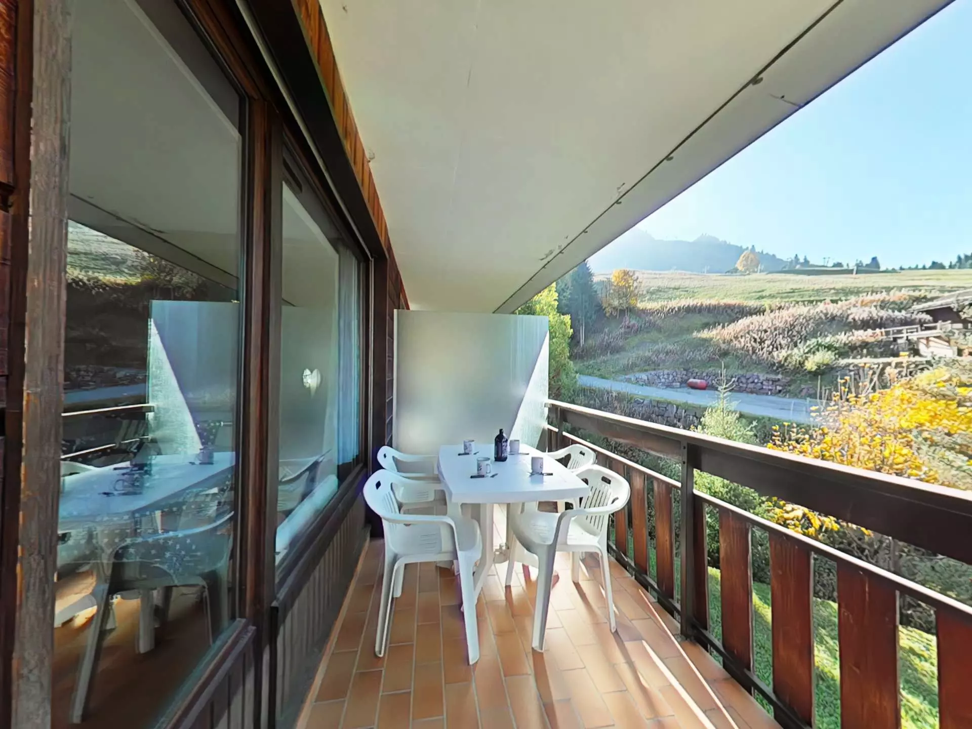Cet appartement de vacances au 1er étage comprend un séjour avec un canapé d'agrément et télévision, un balcon avec vue sur domaine skiable et vue légère sur la Colombière, un coin cuisine équipé, une cabine avec 2 lits superposés, une salle d'eau avec WC. A l'étage, une mezzanine avec 1 lit double et un WC avec lave-main .