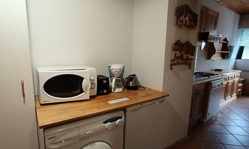 Coin cuisine : Plaques électriques 4 feux, réfrigérateur "top" avec compartiment freezer, micro-ondes, petit four grill, cafetière, grille-pains, bouilloire, cocotte minute, appareil à raclettes, nombreux accessoires de cuisine.