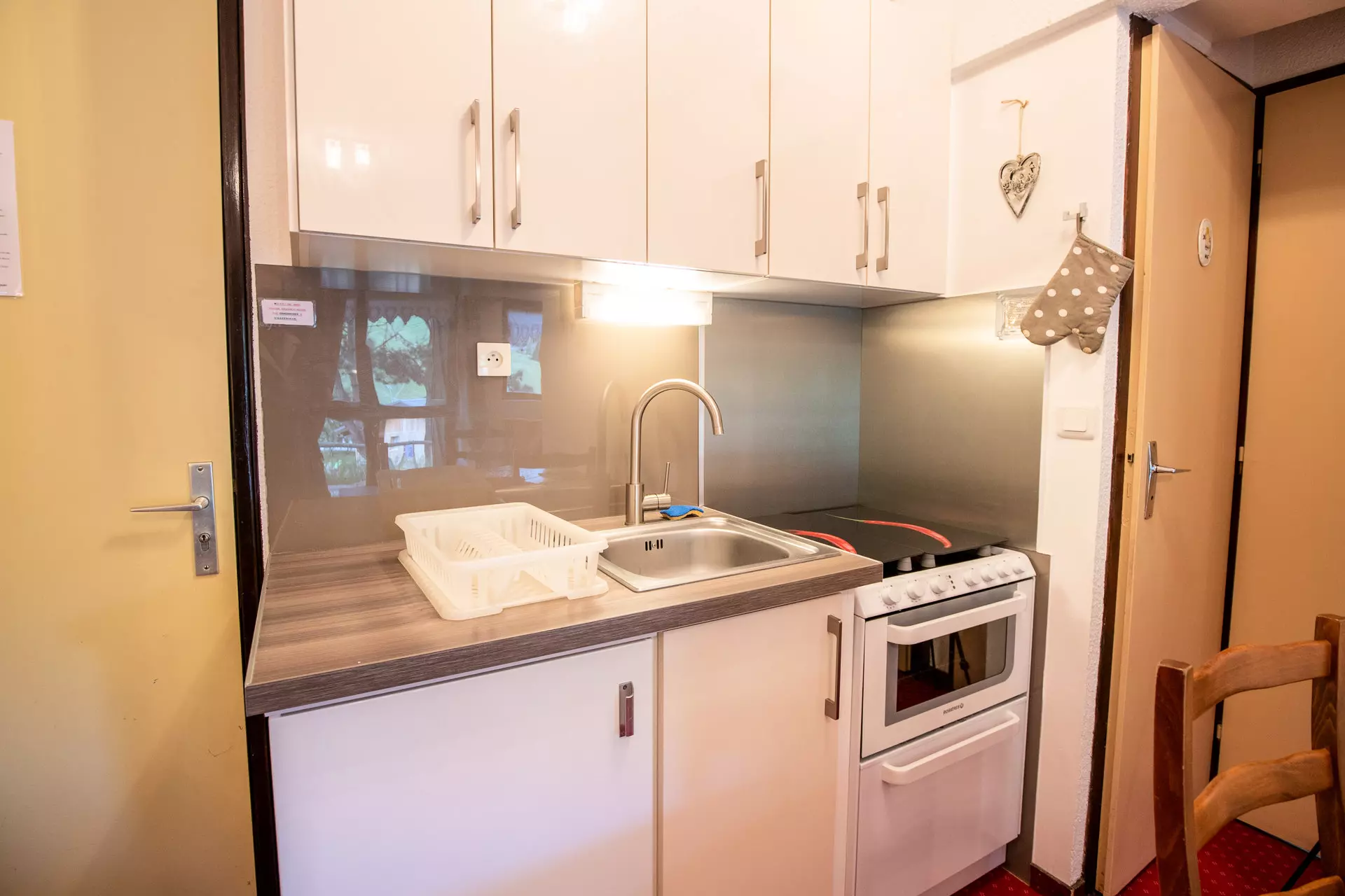 Coin cuisine : plaque vitrocéramique, four combiné, réfrigérateur et tout le nécessaire de vaisselle.