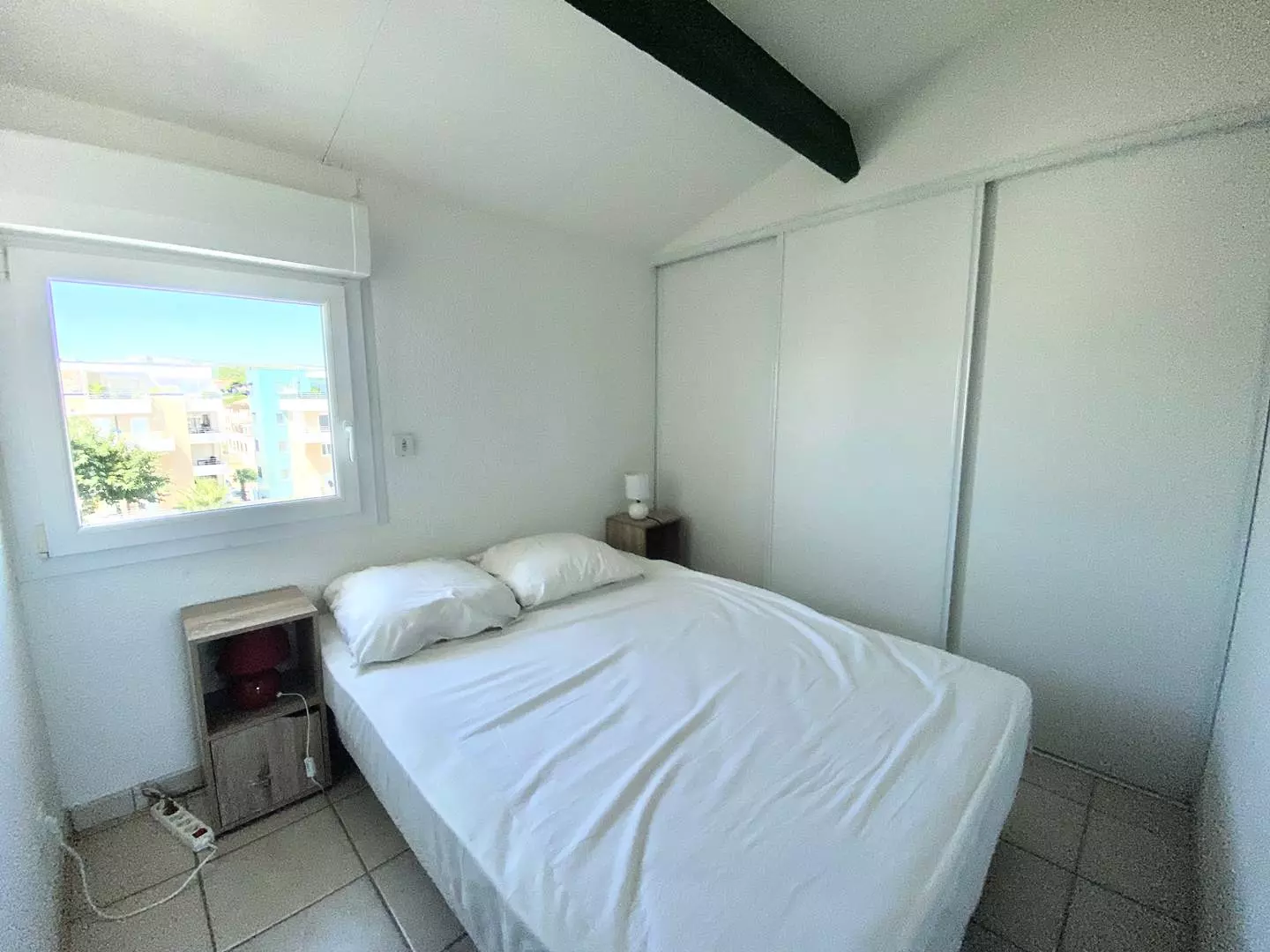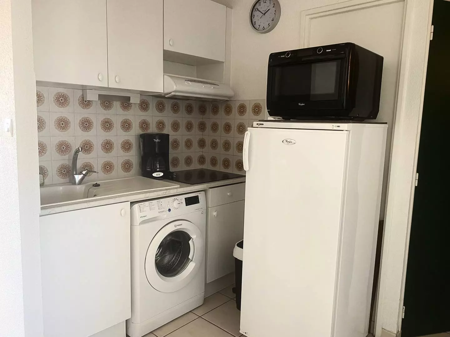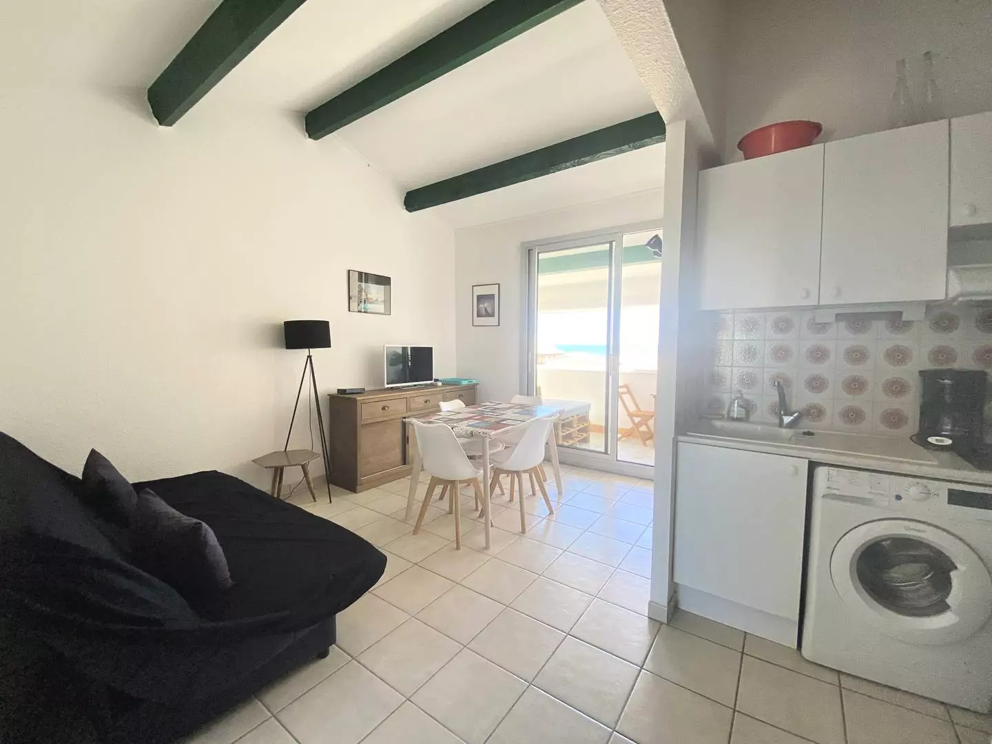 Loggia avec une vue sur la mer, deux chambres, cuisine équipée (lave-linge, frigo, four...) et salle d'eau.