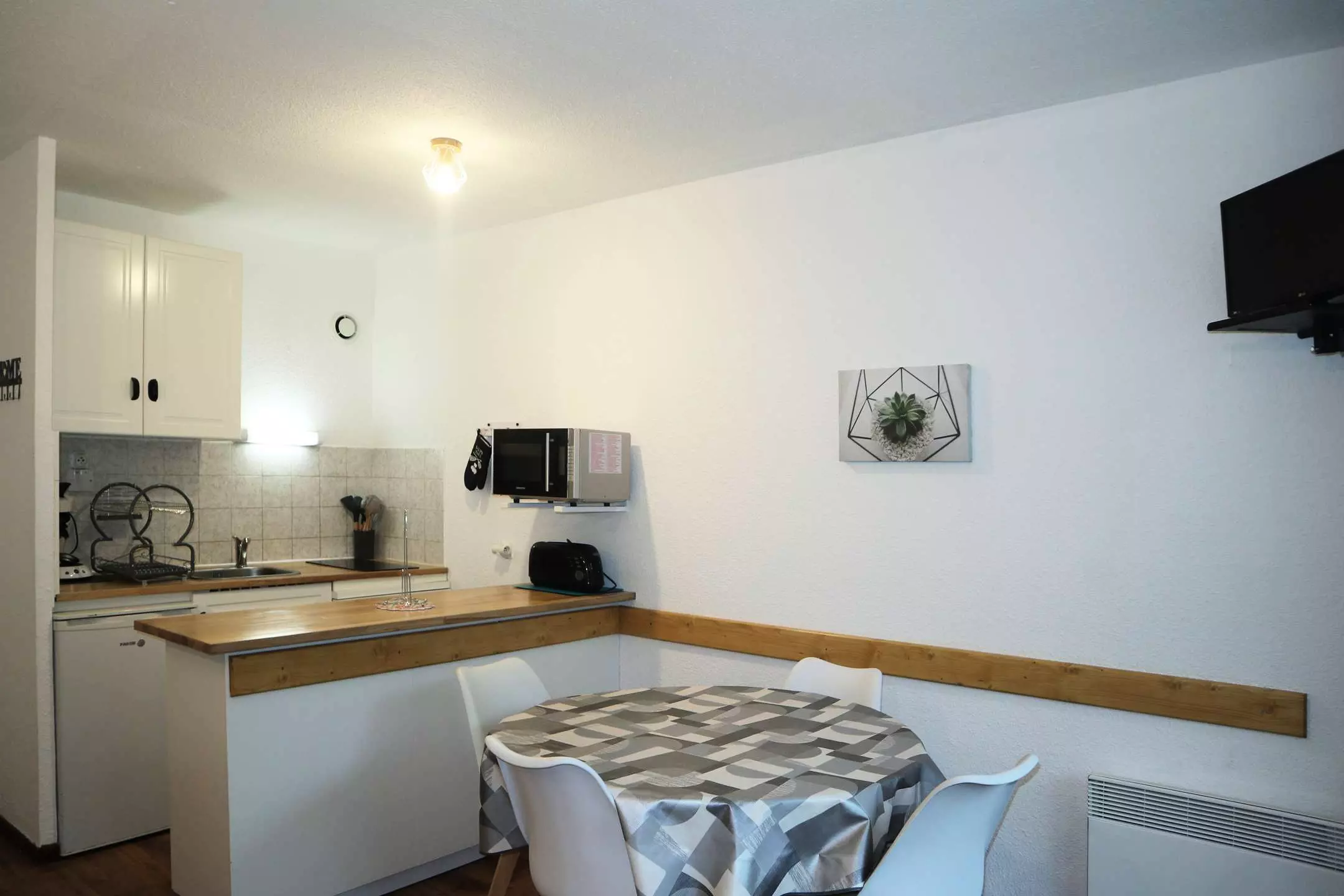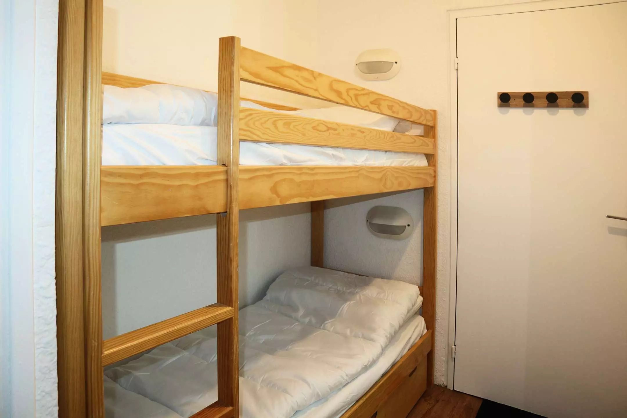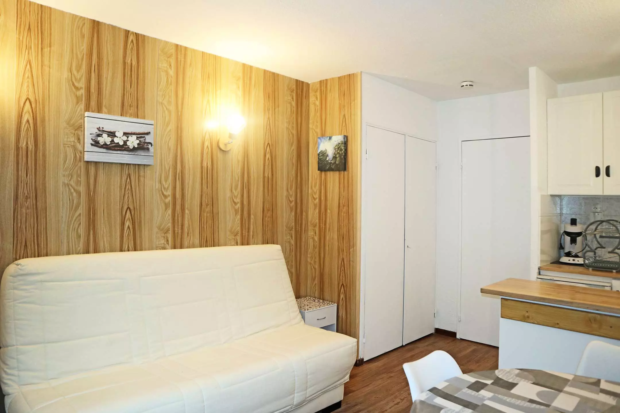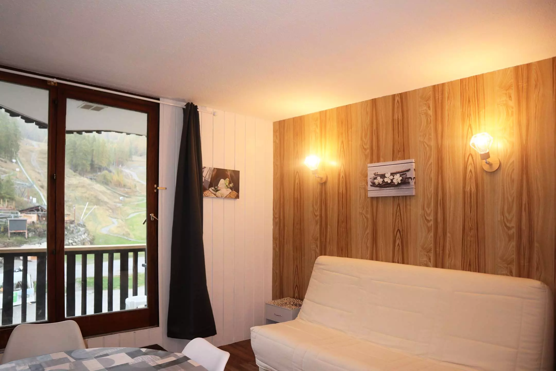 Dans la résidence Les Carlines au dessus du centre commercial, départ skis aux pieds. Grand studio rénové équipé pour 4 personnes au sixième étage de la résidence avec ascenseur, comprenant : une entrée avec 2 lits superposés 1 place, un séjour avec 1 banquette convertible 2 places, une salle d'eau et wc indépendants, un coin cuisine ouvert sur le séjour.