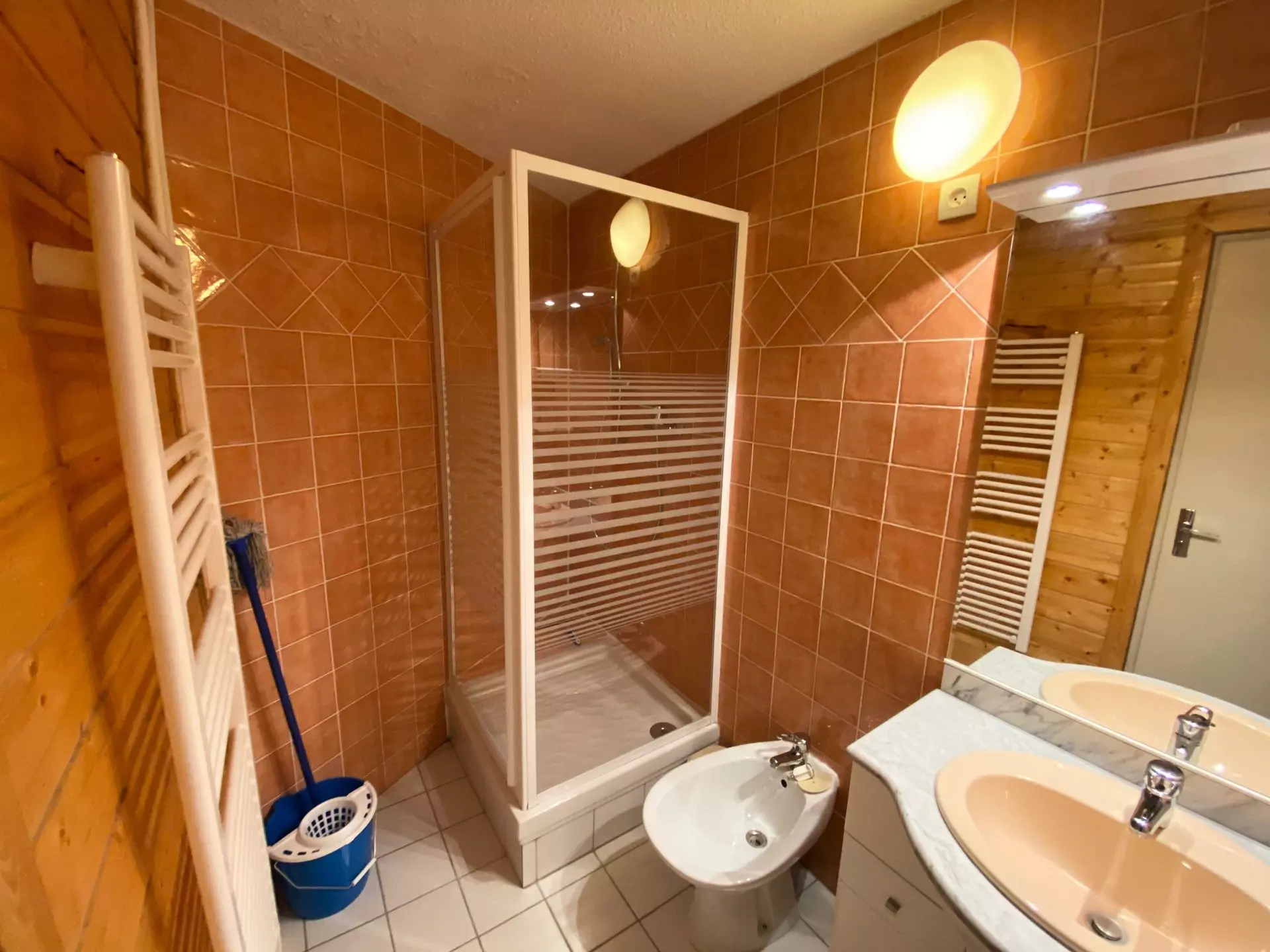 Salle de bain : Douche à l'italienne, meuble avec vasque, bidet, wc, seche serviette électrique mural, lave-linge séchant (dans le placard couloir)