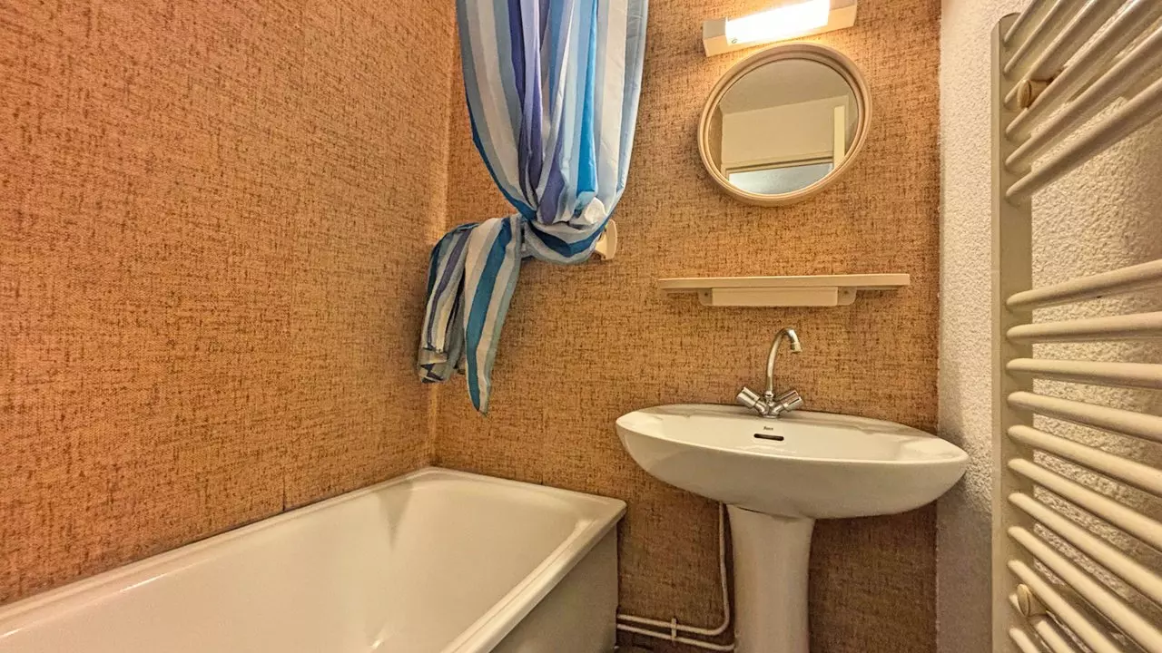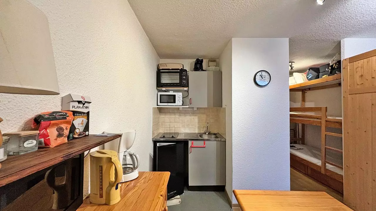 Cet appartement est composé d'une salle de bain avec baignoire et WC indépendant, un coin cuisine équipé d'un mini four, d'un micro-ondes, d'une cafetière à filtre et d'une cafetière Delonghi, ainsi qu'une bouilloire..., un séjour avec télévision et canapé Clic clac, un coin montagne avec deux lits superposés, une chambre avec un lit double en 140.