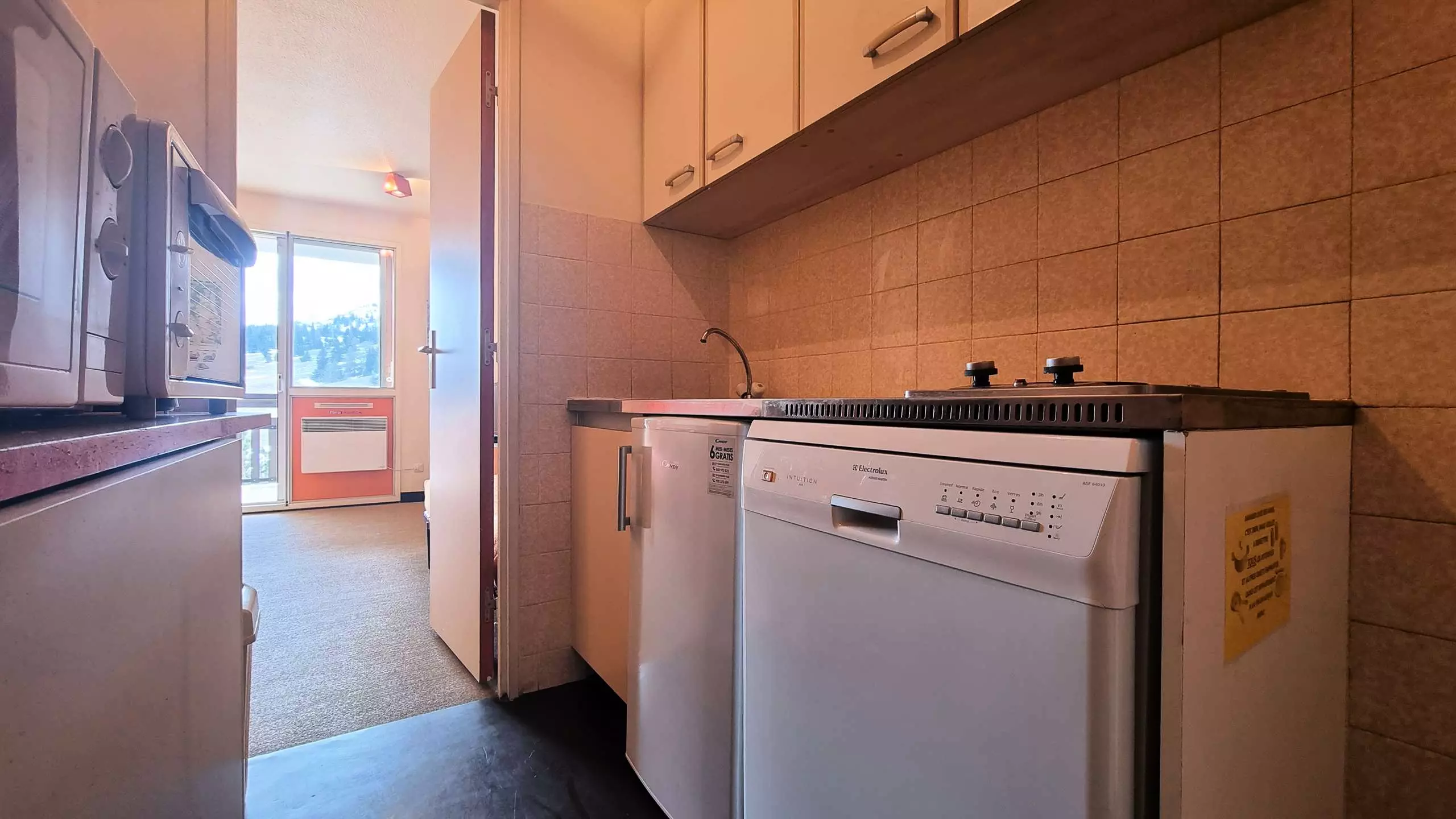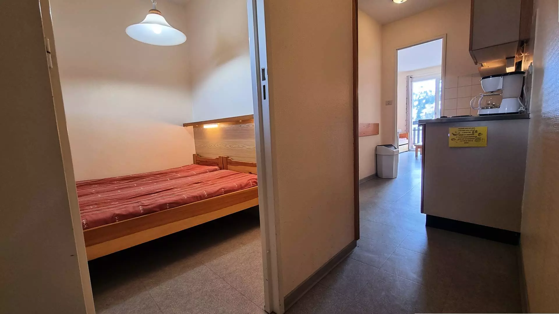 Cet appartement se compose d'une entrée, une chambre avec deux lits simple, une cuisine séparée équipée : d'une plaque électrique 2 feux, lave vaisselle, micro onde...