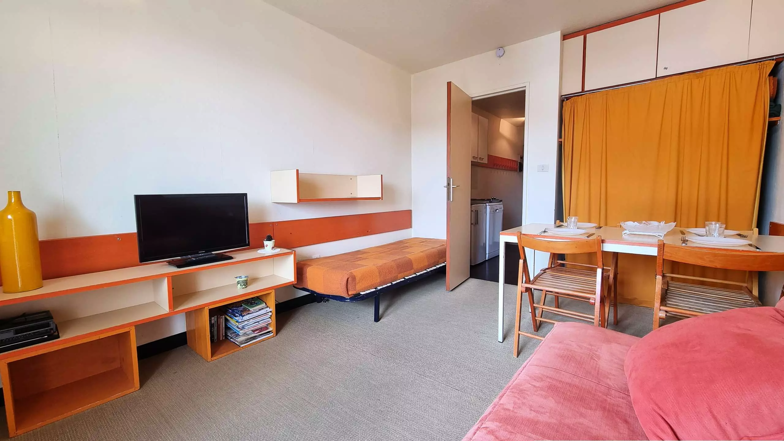 La pièce à vivre comprend un clic-clac en 130x190 et un lit simple en 80x190 avec TV.