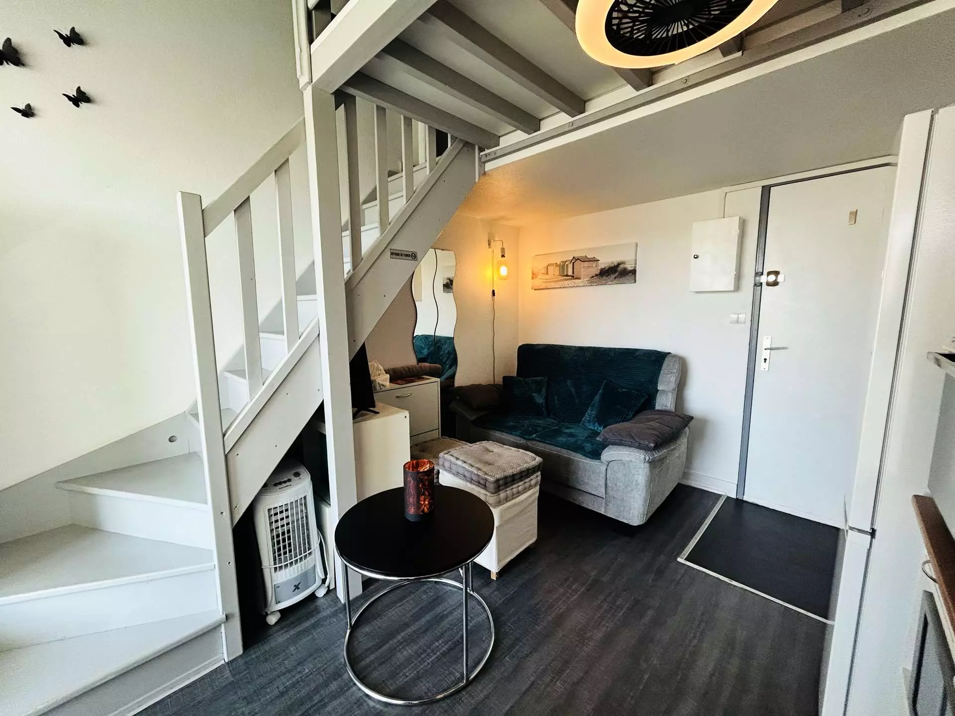 Cette location d'appartements de vacances, au dernier étage, se compose d'un séjour avec canapé et télévision (sous réserve d'une bonne réception), d'un coin cuisine équipé, d'une chambre avec un lit 2 personnes (140), salle d'eau avec wc et une mezzanine avec un canapé convertible 2 personnes.