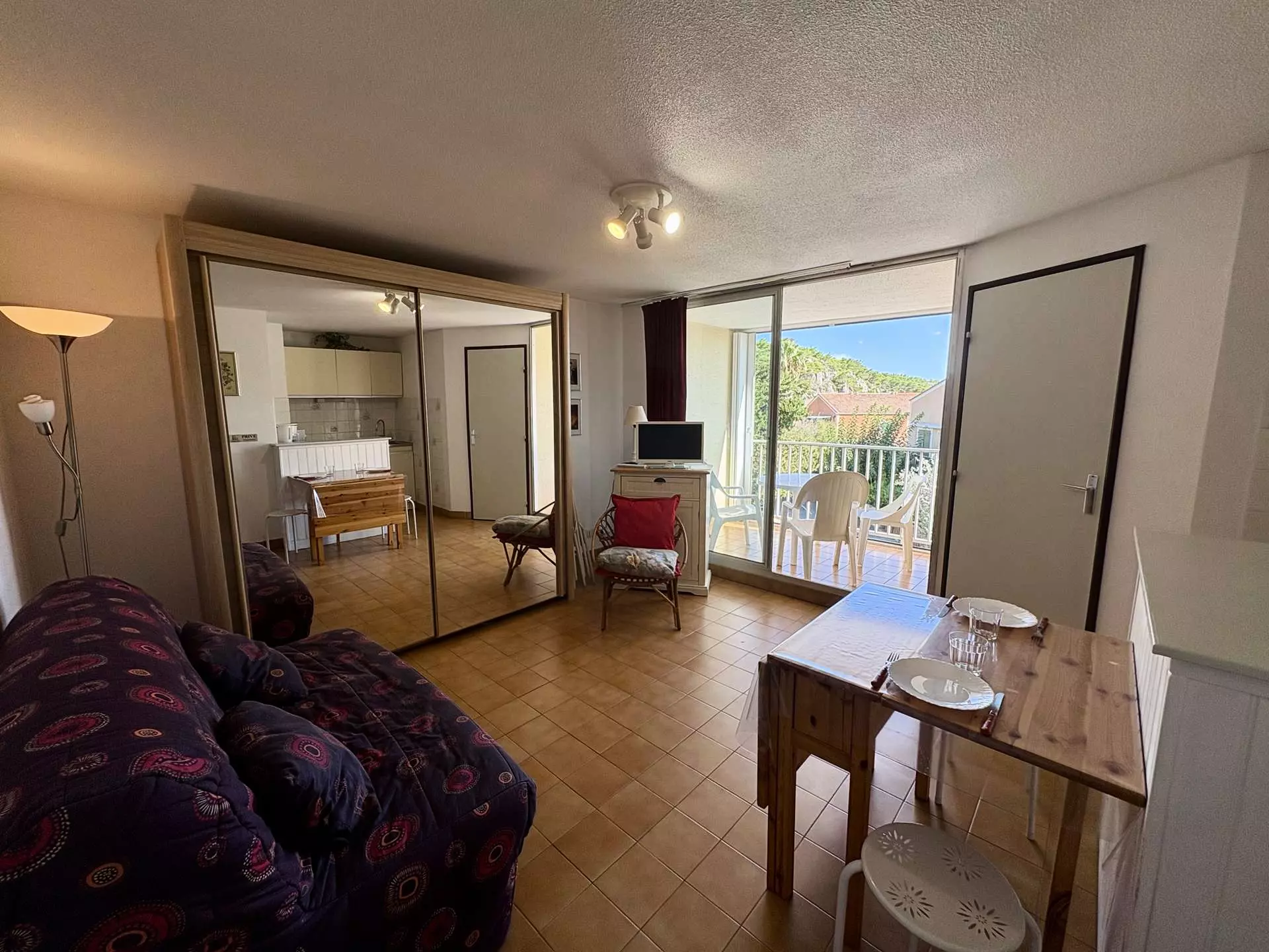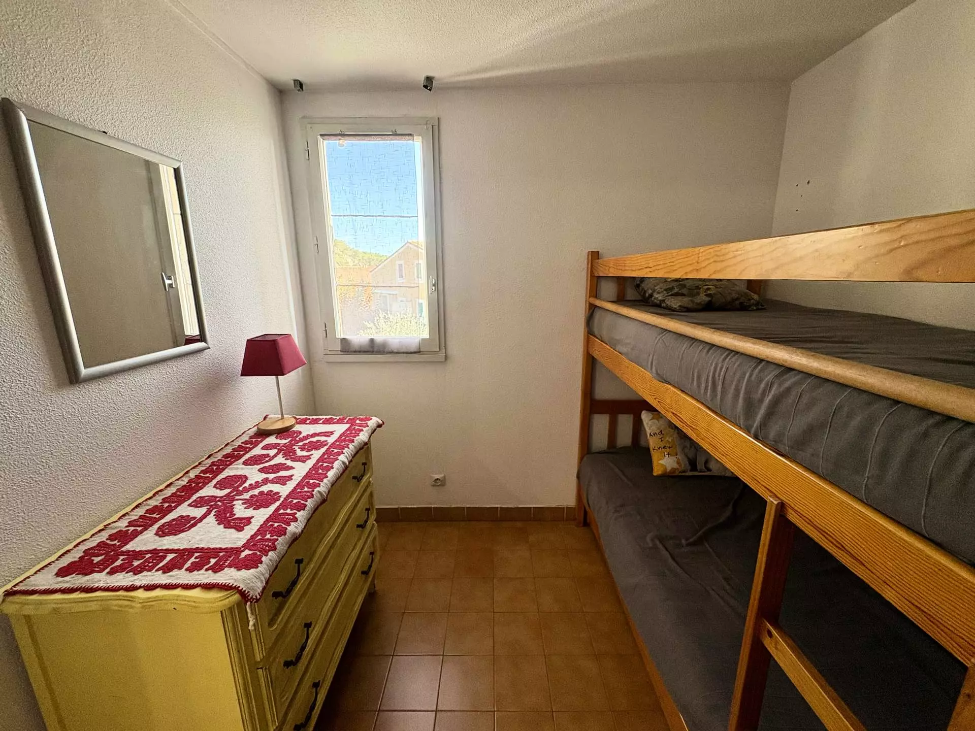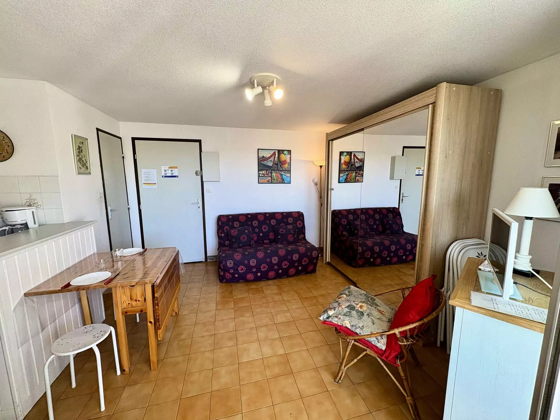 Cette location saisonnière à la mer dispose d'un séjour avec un canapé convertible 2 places et télévision (sous réserve d'une bonne réception), d'un coin cuisine équipé, d'une chambre avec un lits superposés et d'une salle d'eau avec WC.