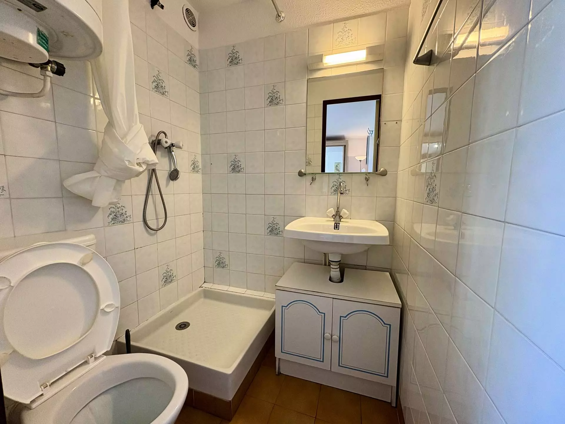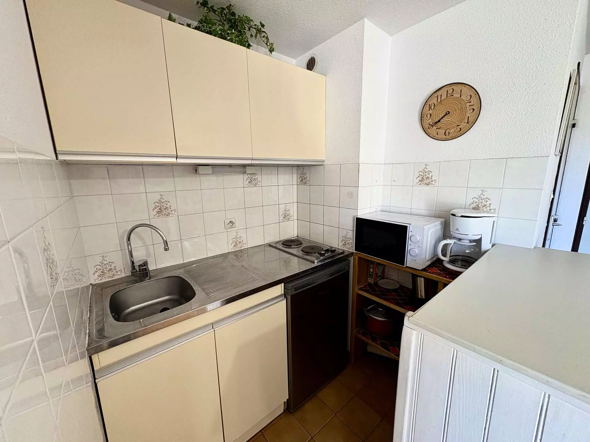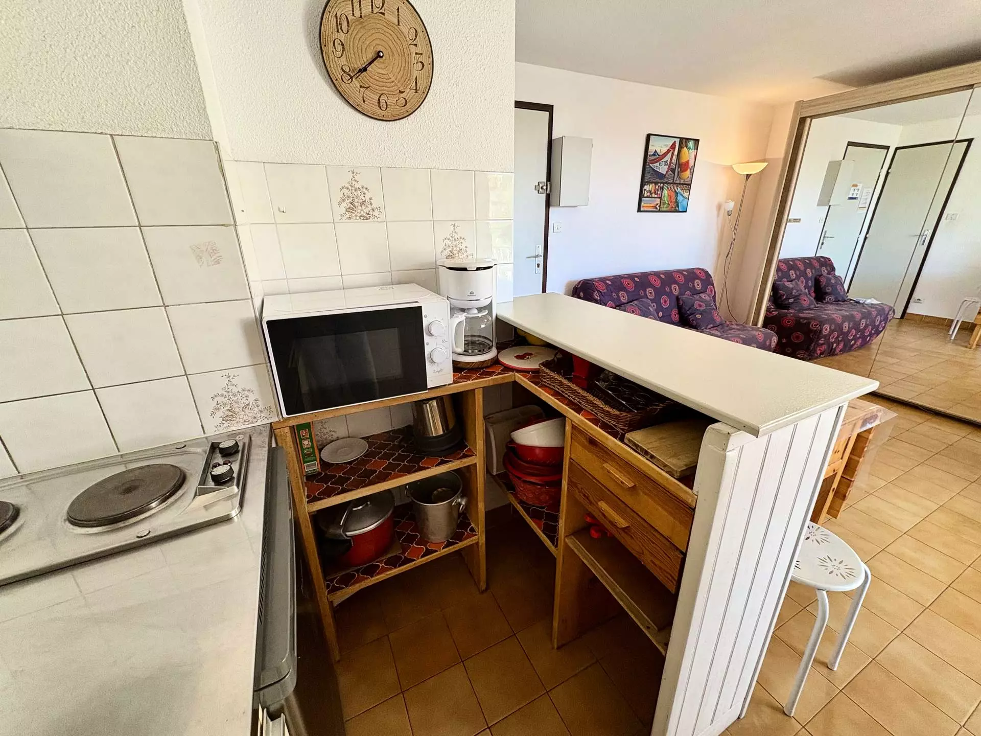 Cette location saisonnière à la mer dispose d'un séjour avec un canapé convertible 2 places et télévision (sous réserve d'une bonne réception), d'un coin cuisine équipé, d'une chambre avec un lits superposés et d'une salle d'eau avec WC.