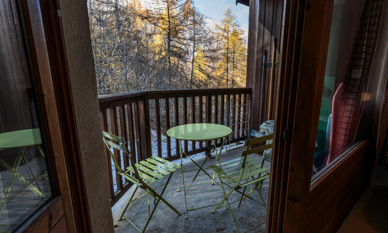 La pièce de vie s'ouvre sur un balcon offrant une vue splendide sur les montagnes environnantes pour des vacances ressourçantes au grand air.