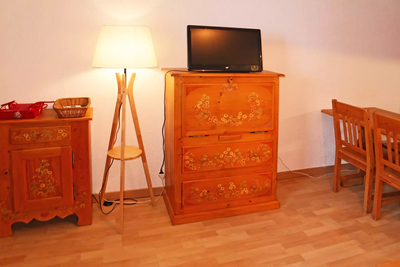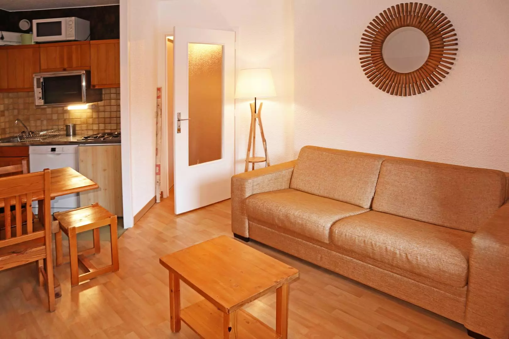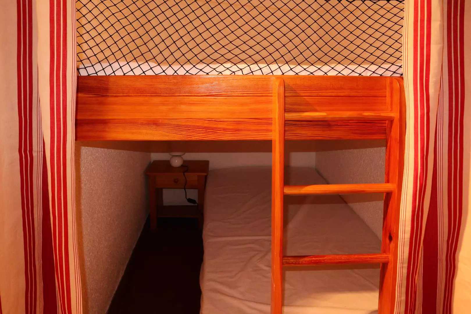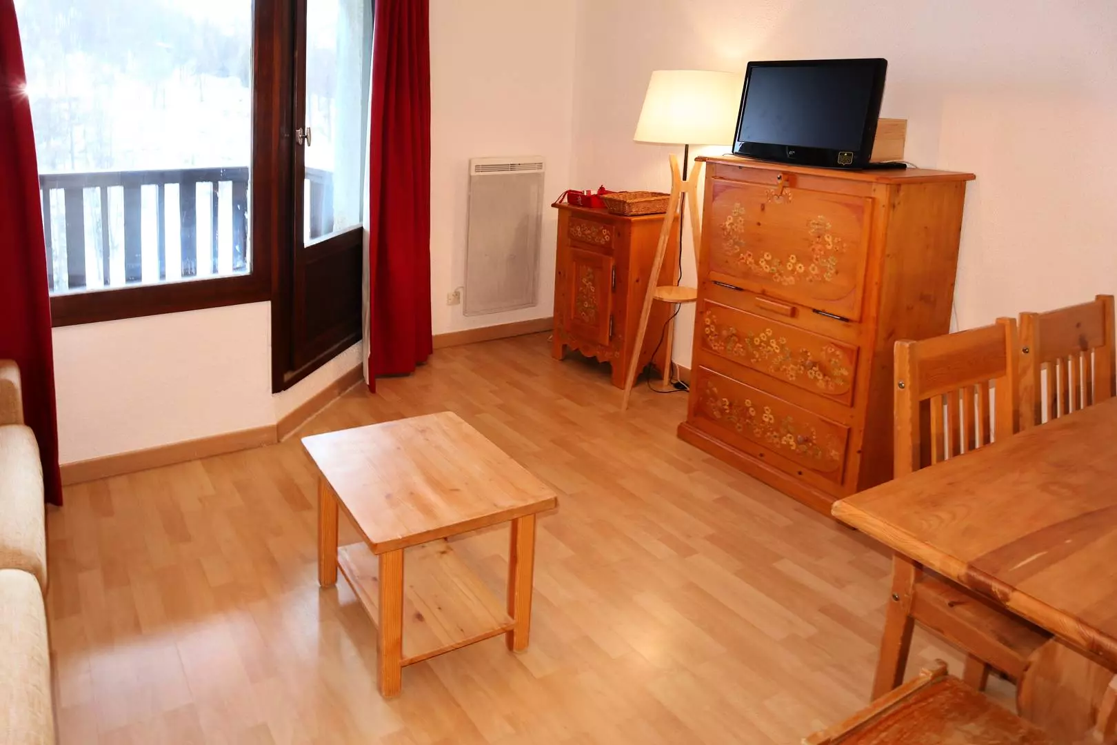 Joli studio équipé pour 4 personnes, idéalement situé au centre de la station, avec départ et retour skis aux pieds de la résidence, 5 ème étage avec ascenseur, accès direct aux commerces, comprenant une entrée avec 2 Lits superposés 1 place, un séjour avec 2 lits gigognes 1 place, un coin cuisine ouvert sur le séjour, une salle d'eau avec WC. Parquet flottant dans le logement. Balcon exposition Est offrant une belle vue sur les pistes.