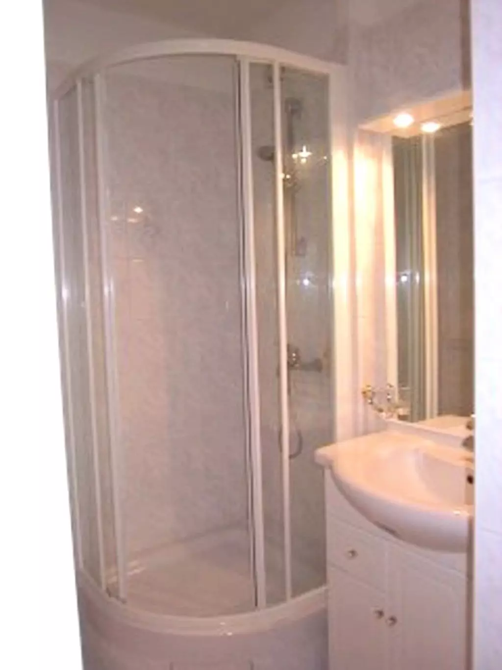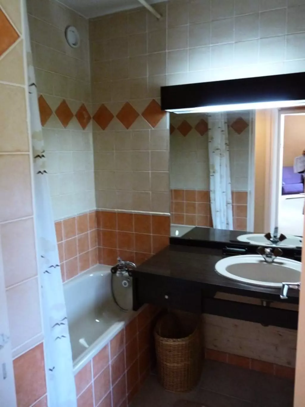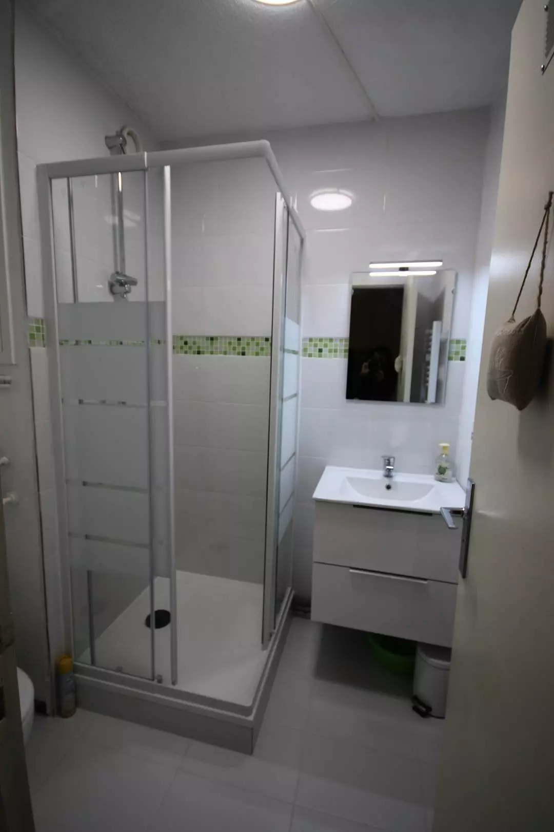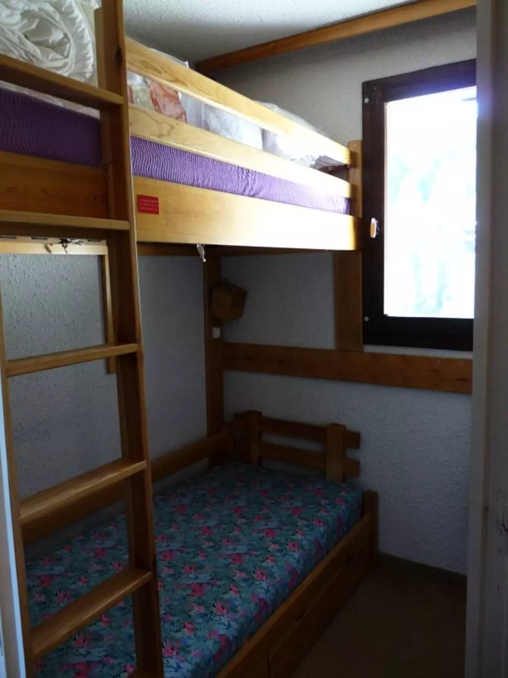 Coin nuit à l'entrée de l'appartement avec 2 lits superposés 1 places, salle de bain avec baignoire, wc séparés, séjour avec une banquette clic-clac 2 personnes et coin cuisine équipé ouvert sur le séjour.