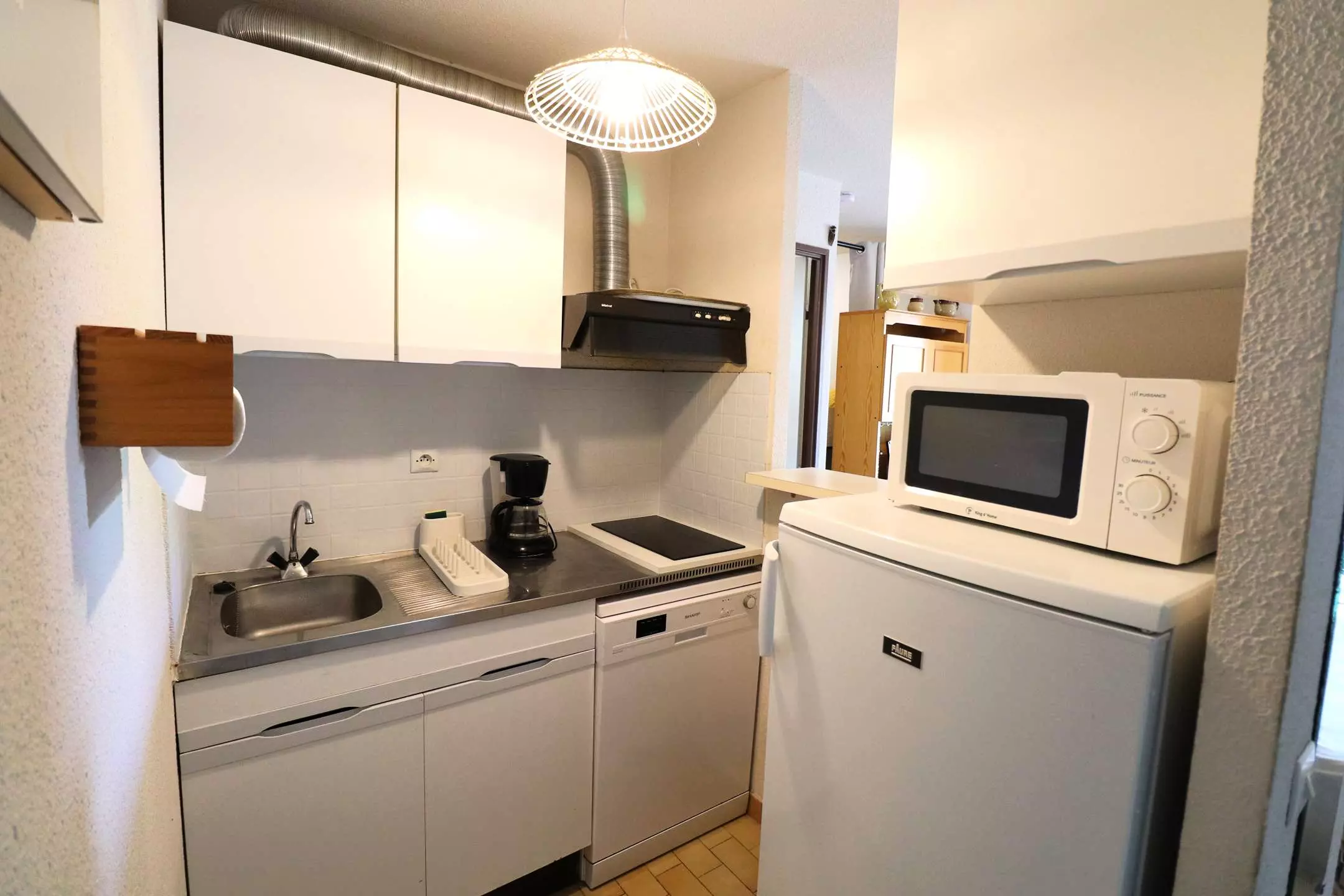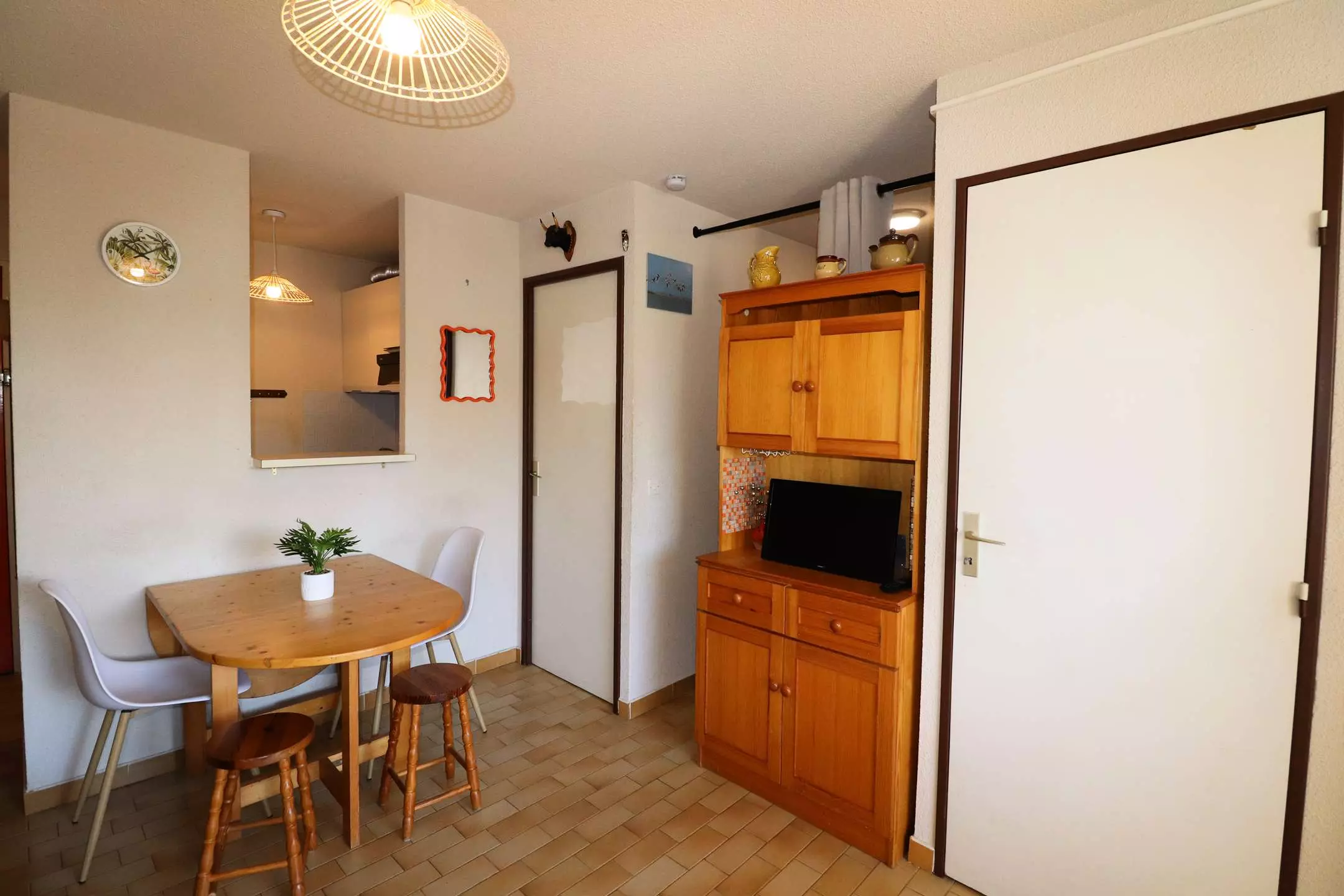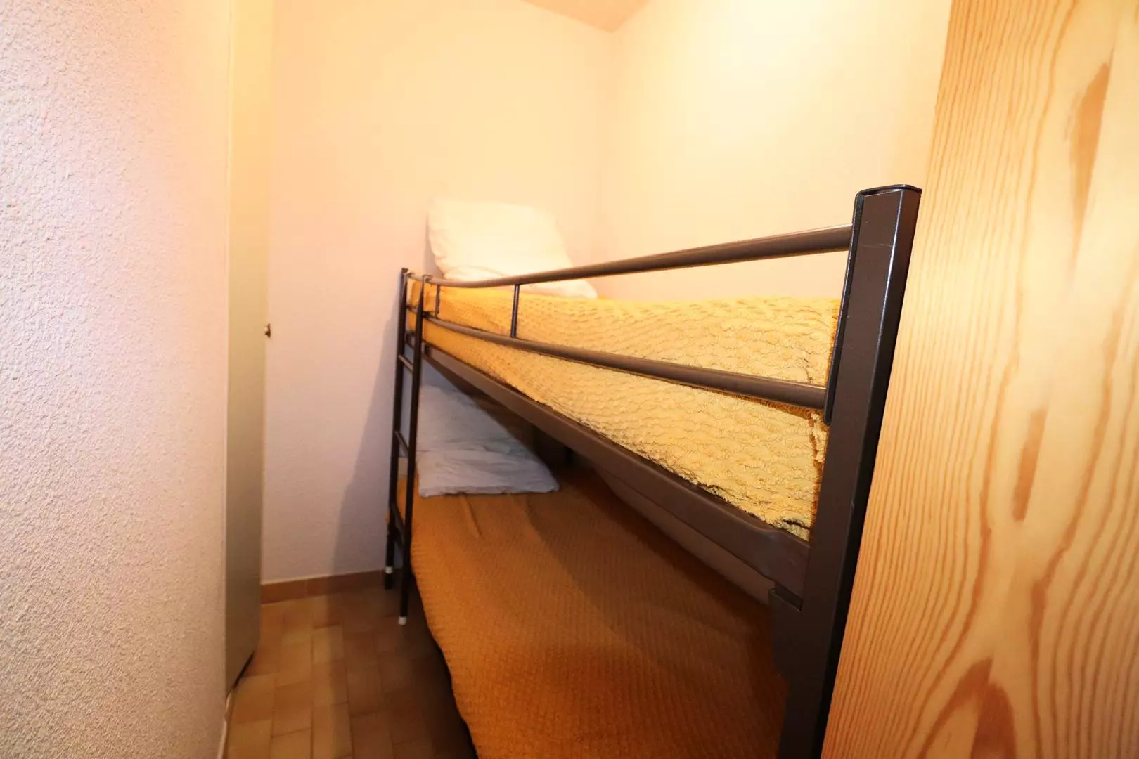 L'appartement se compose d'une entrée, d'une kitchenette équipée avec passe-plat, d'un grand séjour lumineux, d'un coin cabine avec 2 lits superposés, ainsi que d'une salle d'eau. Les WC sont séparés. La chambre, équipée d'un lit double, dispose d'une fenêtre et d'un placard de rangement pour un maximum de confort.