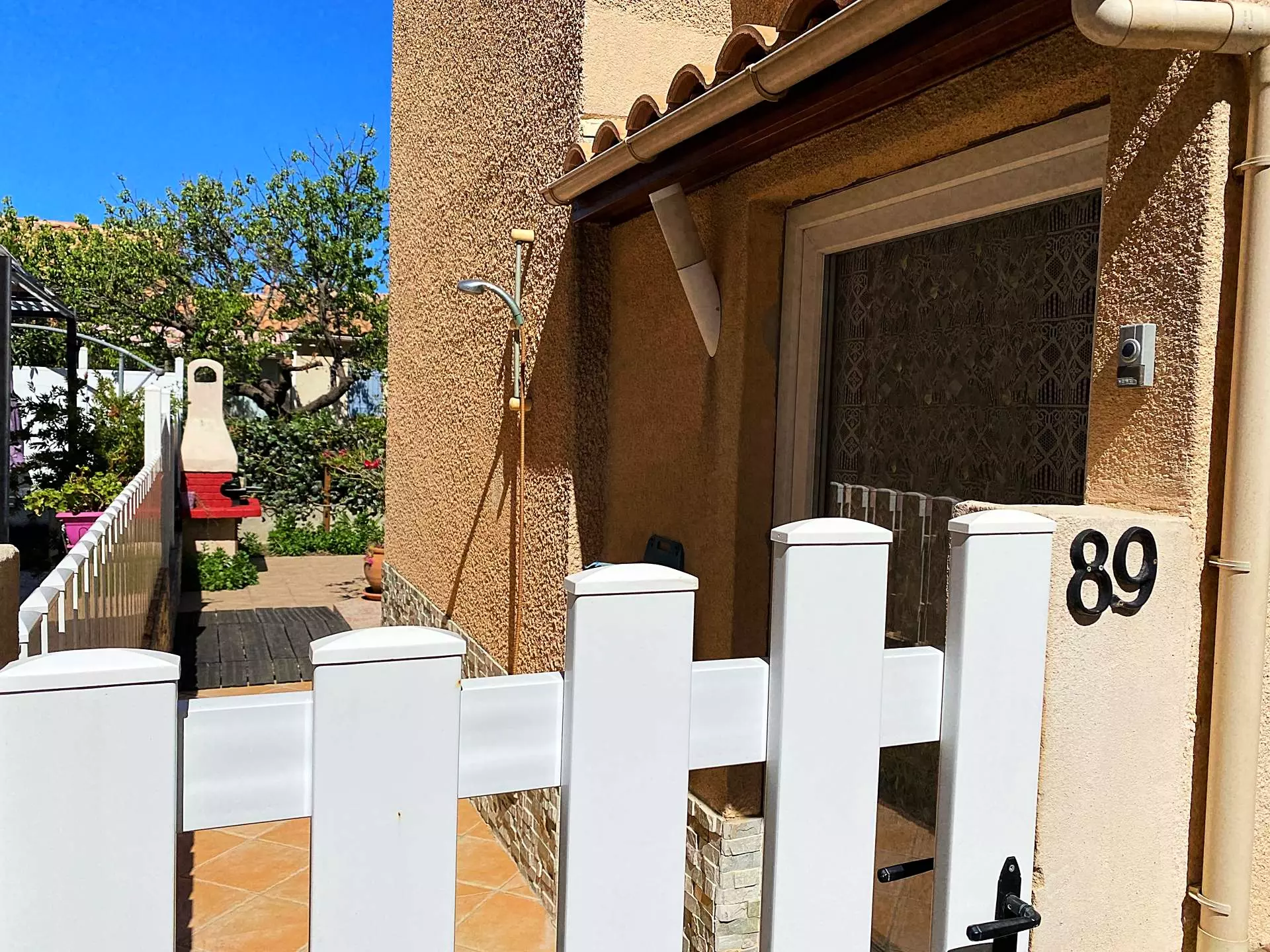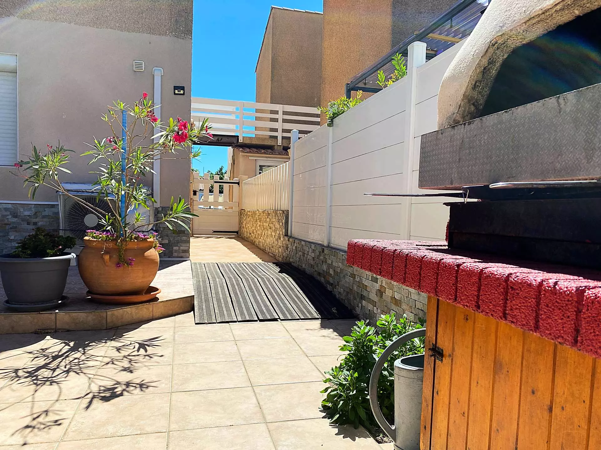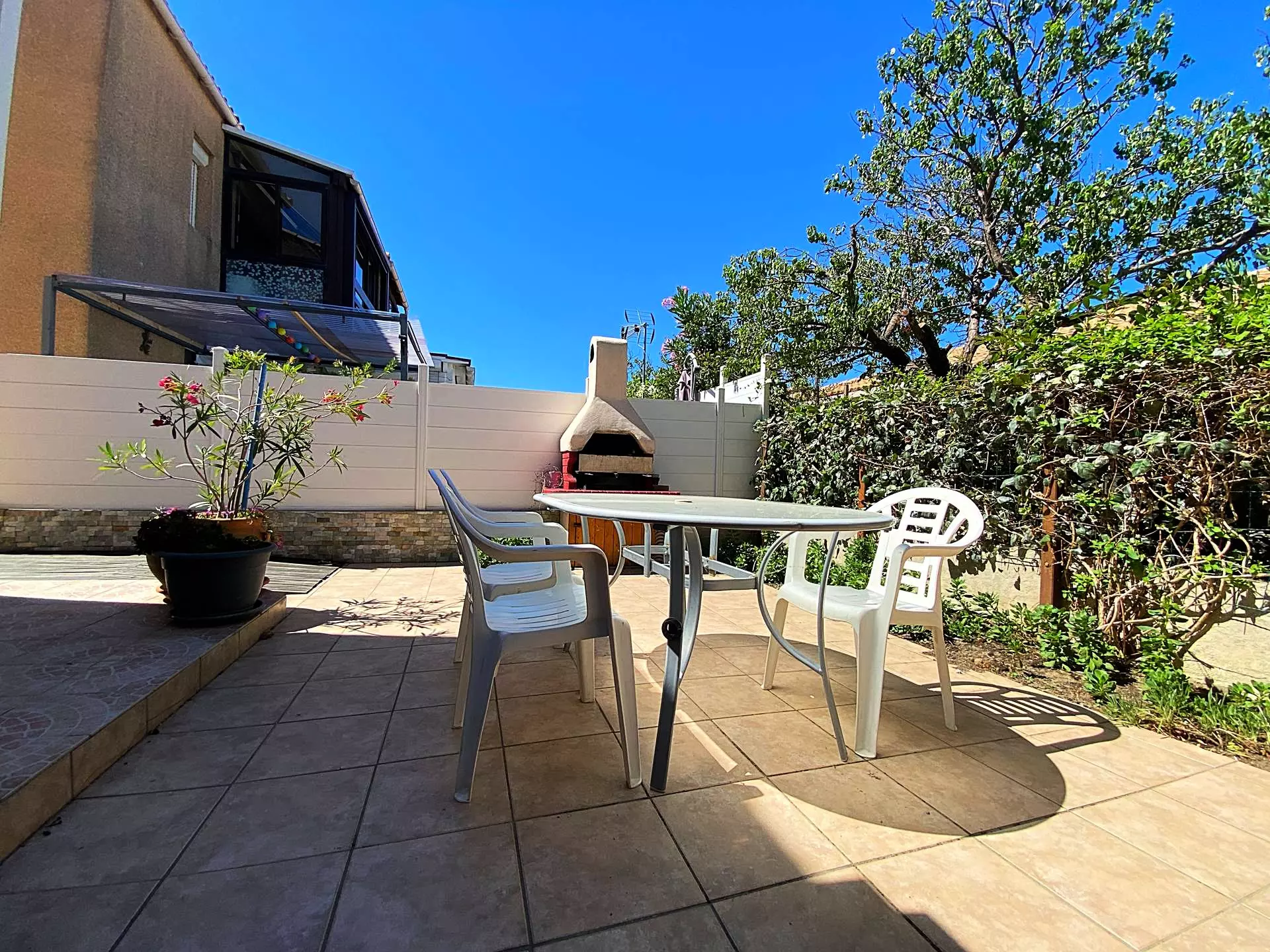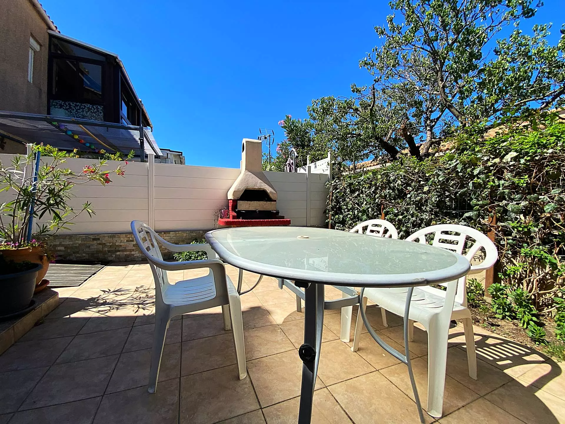 Très jolie terrasse ensoleillée avec barbecue en bâti .