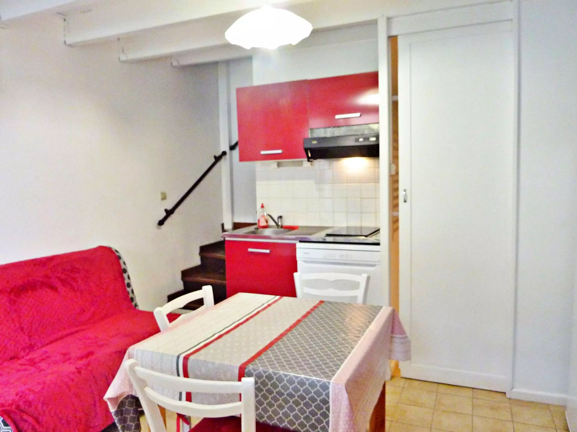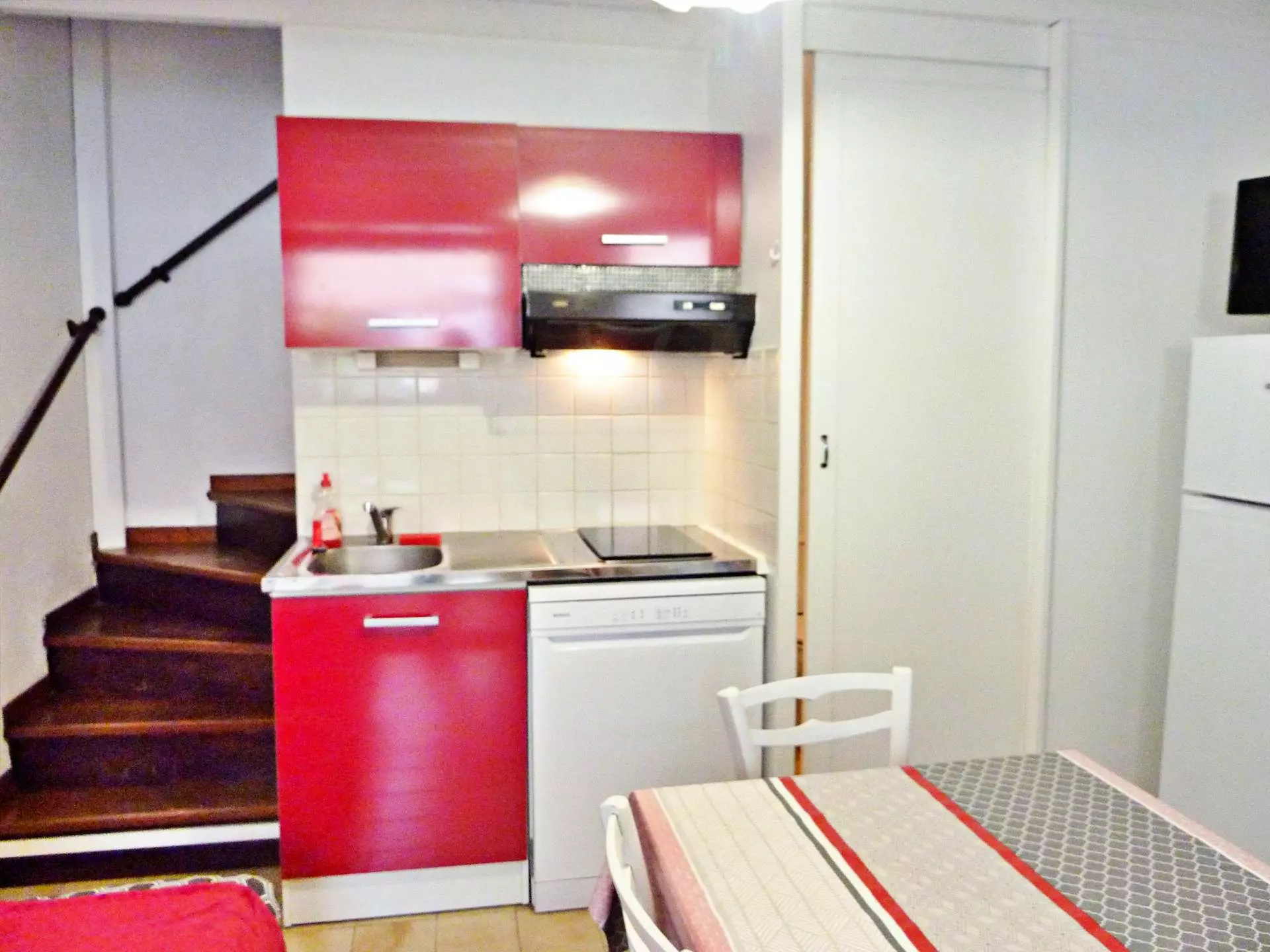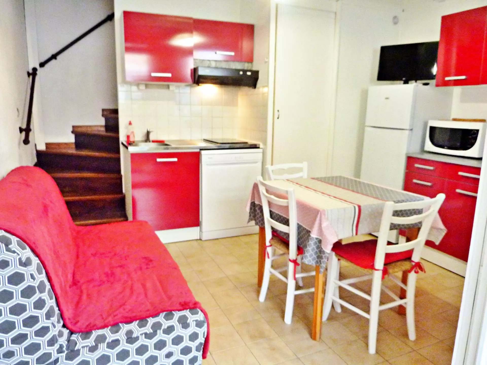 Rez-de-chaussée : Séjour climatisé avec canapé convertible, télévision, table et chaises pour des moments conviviaux. Coin cuisine équipé : micro-ondes, cafetière électrique, réfrigérateur/congélateur, plaque vitrocéramique, lave-vaisselle, grille-pain et vaisselle pour vos repas. Salle d'eau avec douche, lavabo, WC et lave-linge pour plus de commodité.