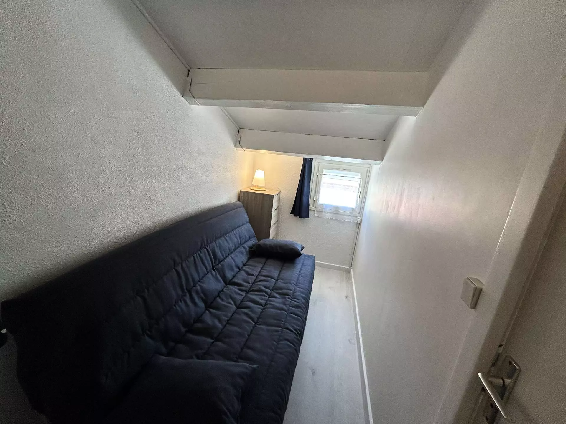 A l'étage : Chambre climatisée avec un grand lit, offrant un espace calme. Coin cabine avec un canapé convertible, parfait pour les enfants.