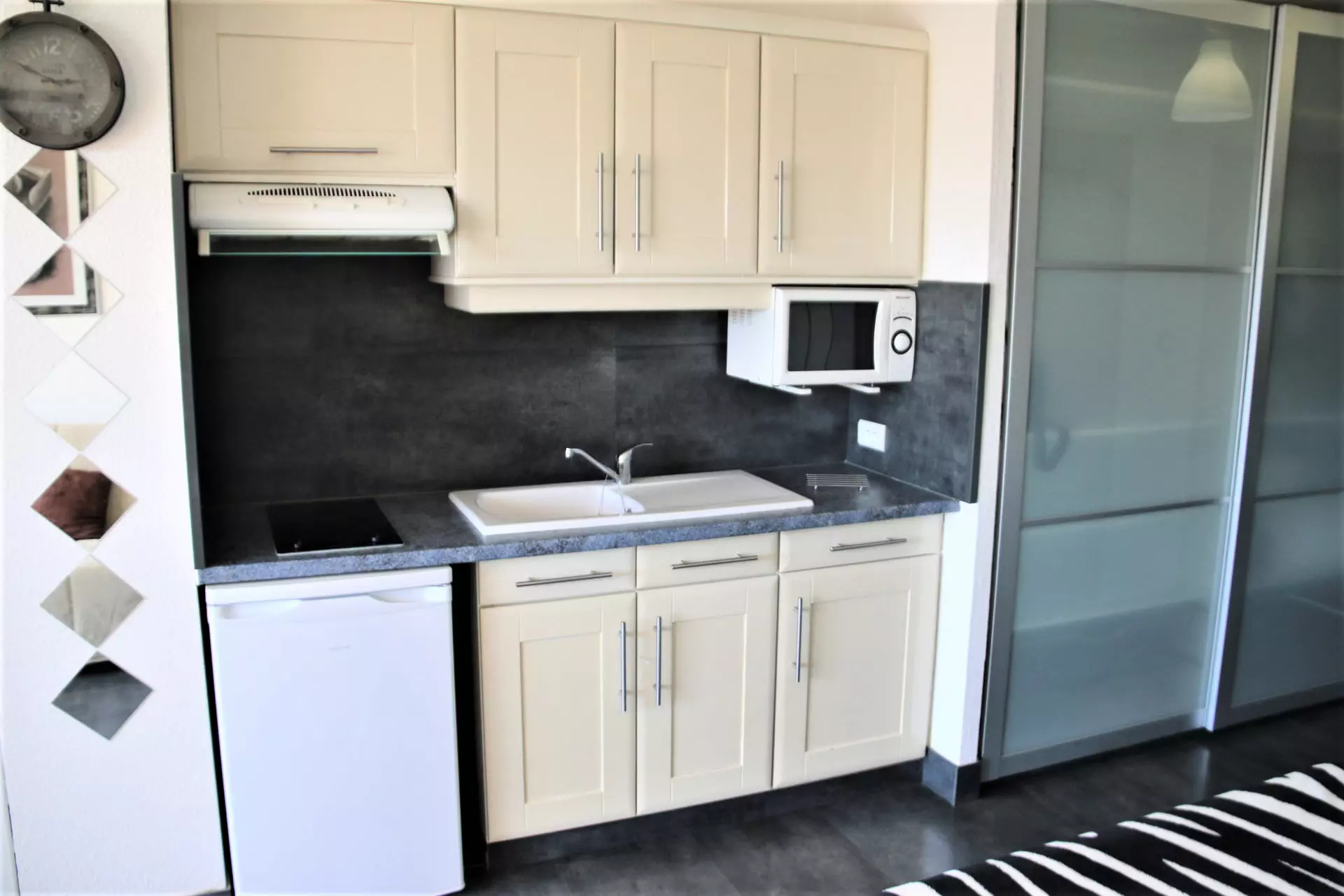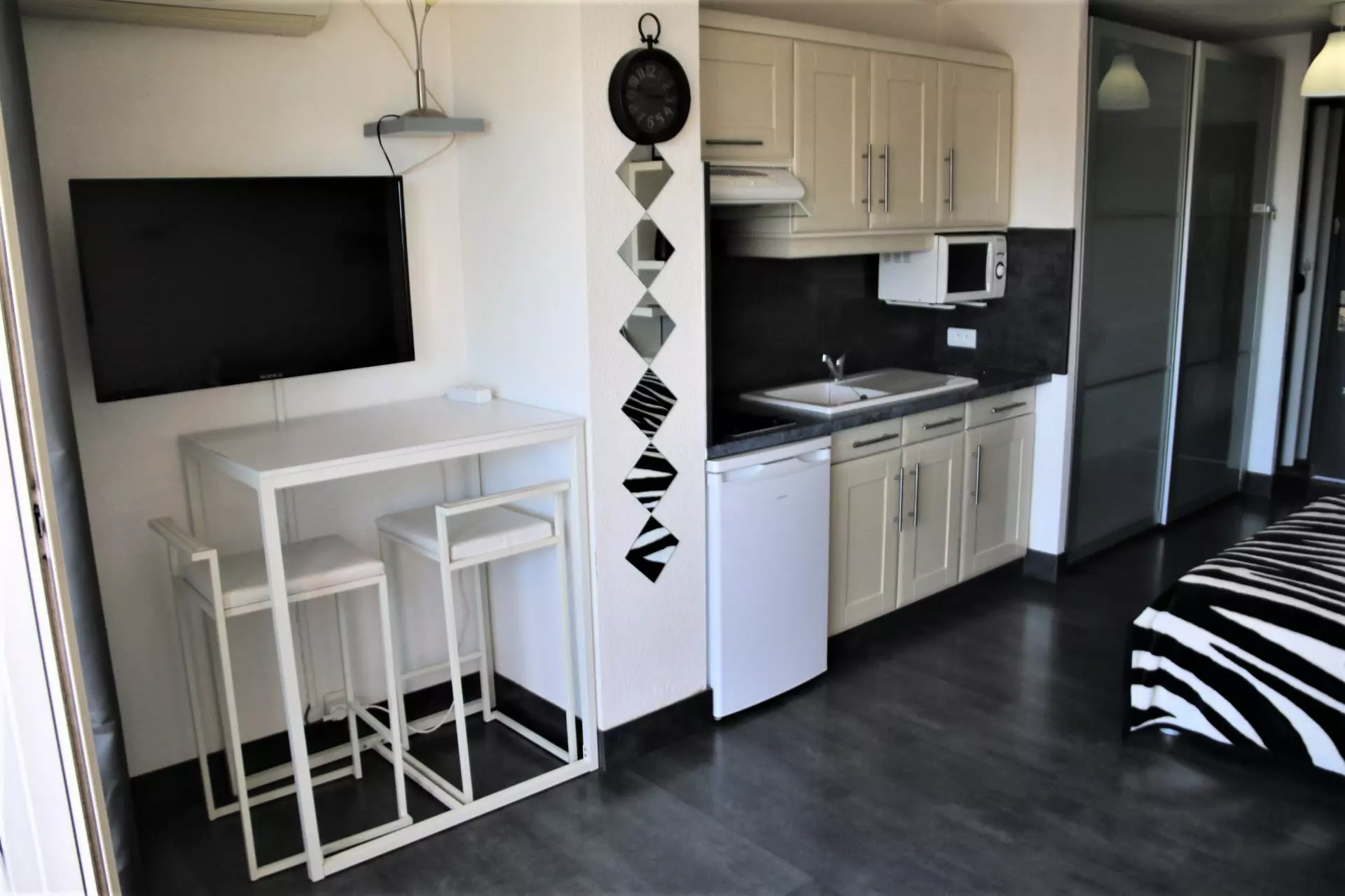 Studio climatisé pour 2 personnes, situé à Héliopolis entrée AB, au 3ème étage avec ascenseur, côté intérieur. Séjour avec un lit en 140cm et un clic clac. Coin cuisine avec micro-ondes, cafetière Senseo. Salle d'eau et WC séparés.Terrasse avec store extérieur, exposition sud. Parking 245.