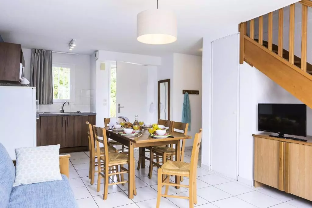 L'équipement comprend une télévision, une plaque vitrocéramique 2 feux, un micro-ondes, un lave-vaisselle, une bouilloire, une cafetière électrique, un réfrigérateur sous plan avec partie freezer et un salon de jardin.