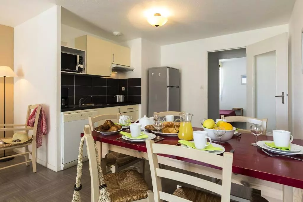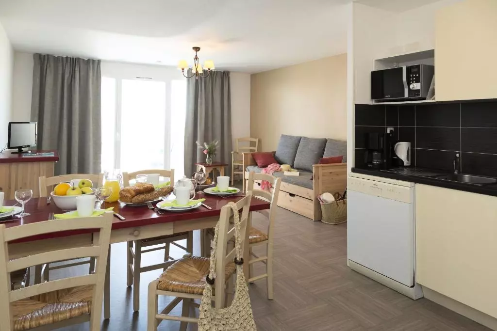 L'équipement comprend une plaque vitrocéramique 4 feux, un réfrigérateur, un micro-ondes, un lave-vaisselle, une cafetière et une bouilloire.