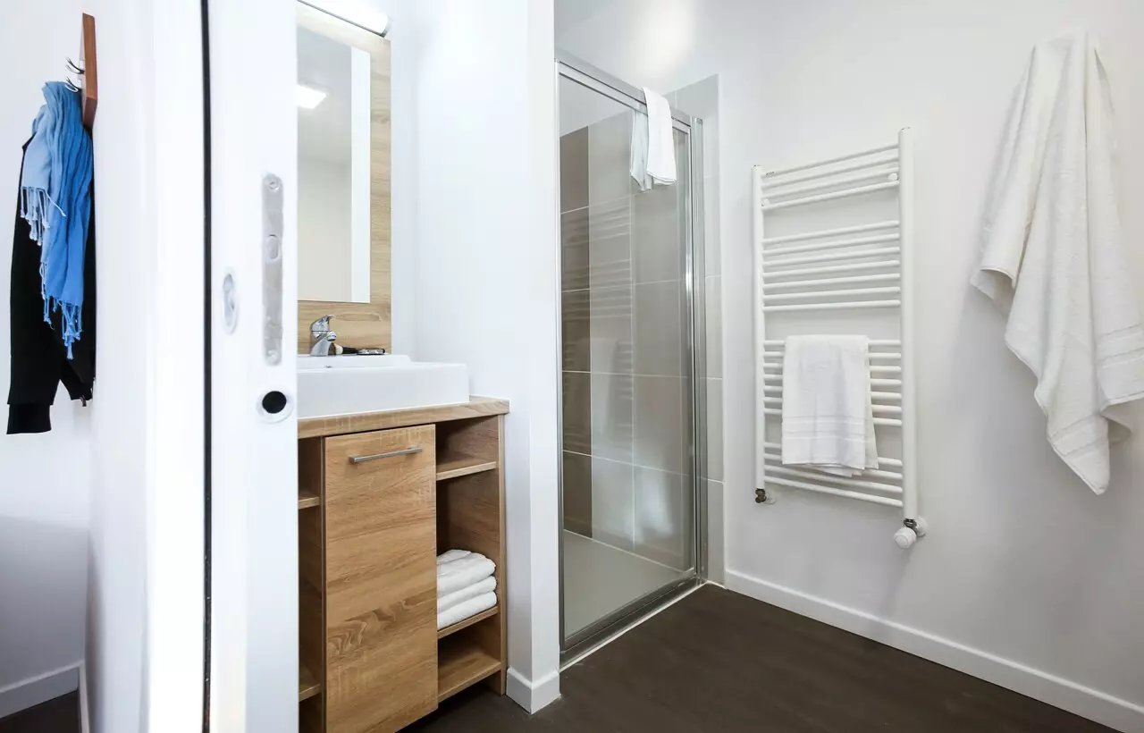 En étage élevé (6 et 7e étage), retrouvez tout le confort d'un hébergement de qualité et bien équipé pour vous accueillir. Composé d'une trentaine de logements, les intérieurs sont aménagés d'une kitchenette avec plaque 2 feux et hotte, frigo table top, four micro-ondes, cafetière, bouilloire...d'une salle de bain avec douche.