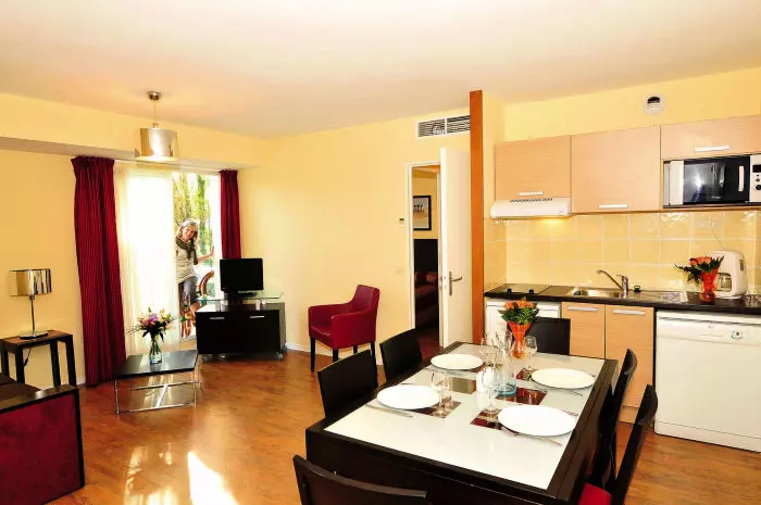 Appartement avec coin cuisine équipé de plaques vitrocéramiques, d'un réfrigérateur, d'un micro-ondes, d'un lave-vaisselle, des ustensiles de cuisine.