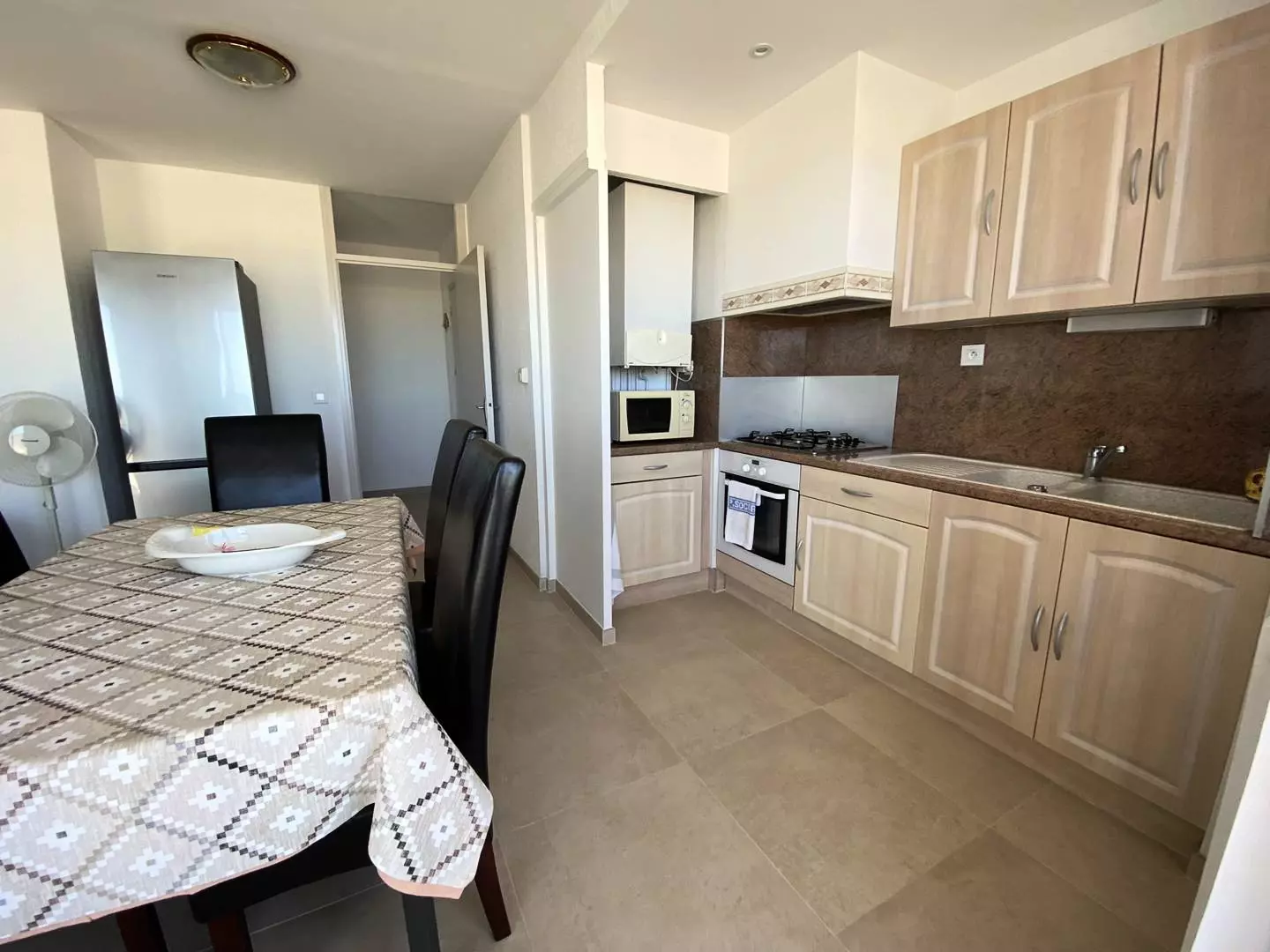La pièce à vivre se compose d'un salon chaleureux et d'un espace salle à manger distinct, créant un cadre agréable et fonctionnel. La kitchenette, en excellent état, est entièrement équipée avec four, quatre feux à gaz, micro-ondes ainsi que réfrigérateur-congélateur. Les chambres, calmes et donnant à l'arrière, accueillent un grand lit et deux lits jumeaux, offrant confort et tranquillité. La salle d'eau a été récemment rénovée et les toilettes sont séparées pour plus de commodité.