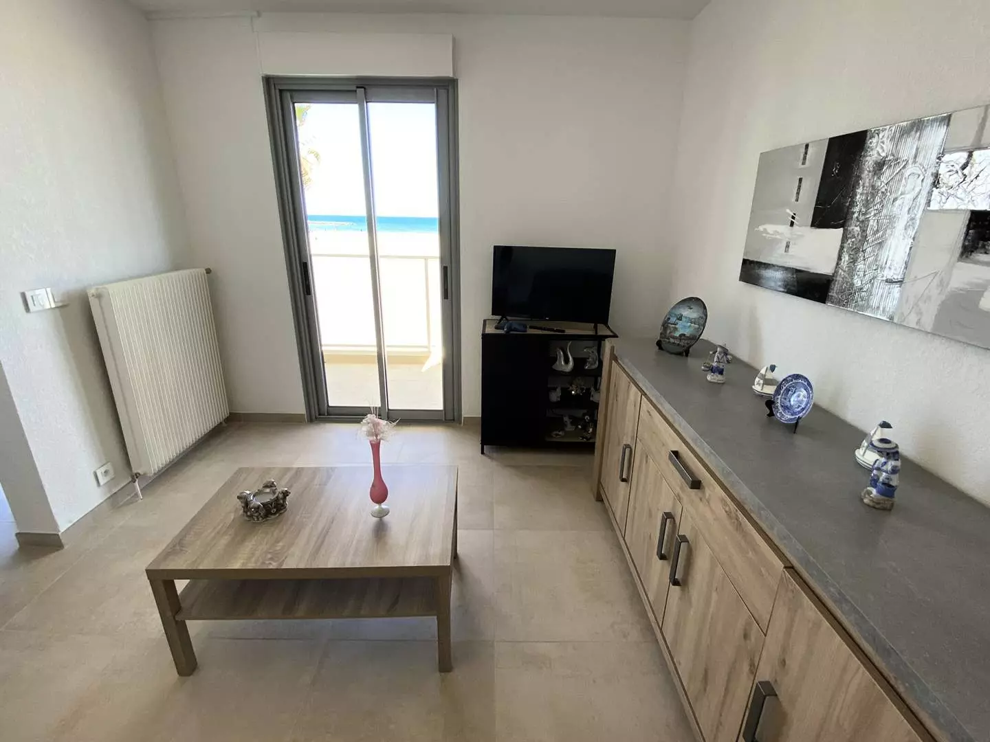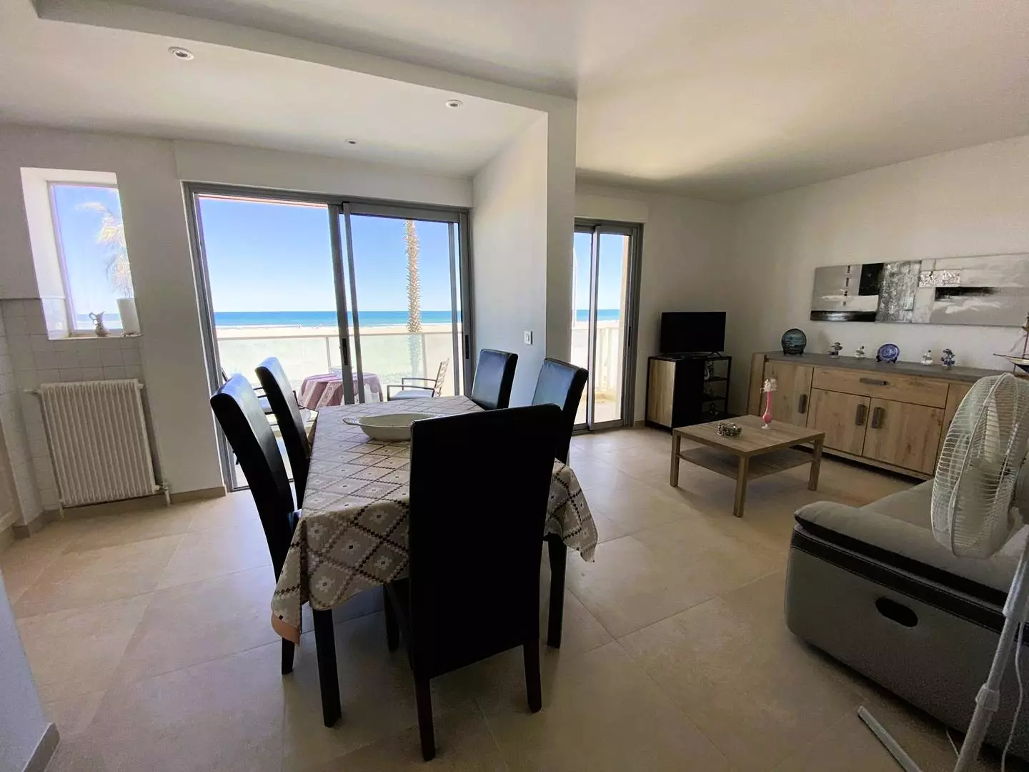 Le séjour s'ouvre sur un balcon offrant une vue directe sur la mer et dispose d'un salon de jardin pour des moments de détente face à l'horizon.