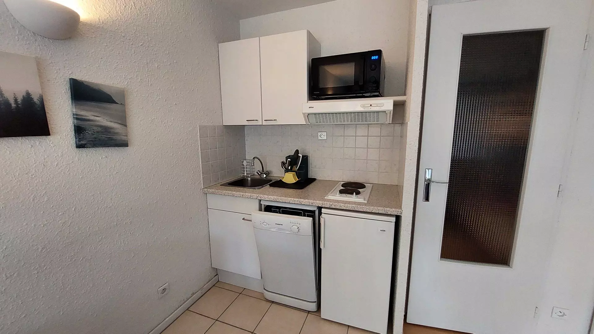 Equipement: 2 plaques electrics, four micro-ondes,réfrigérateur, lave-vaiselle, cafétière, bouilloire