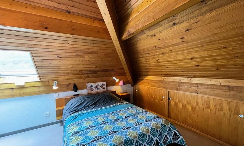 A l'étage, une chambre avec un lit en 140 et fenêtre de toit Velux.