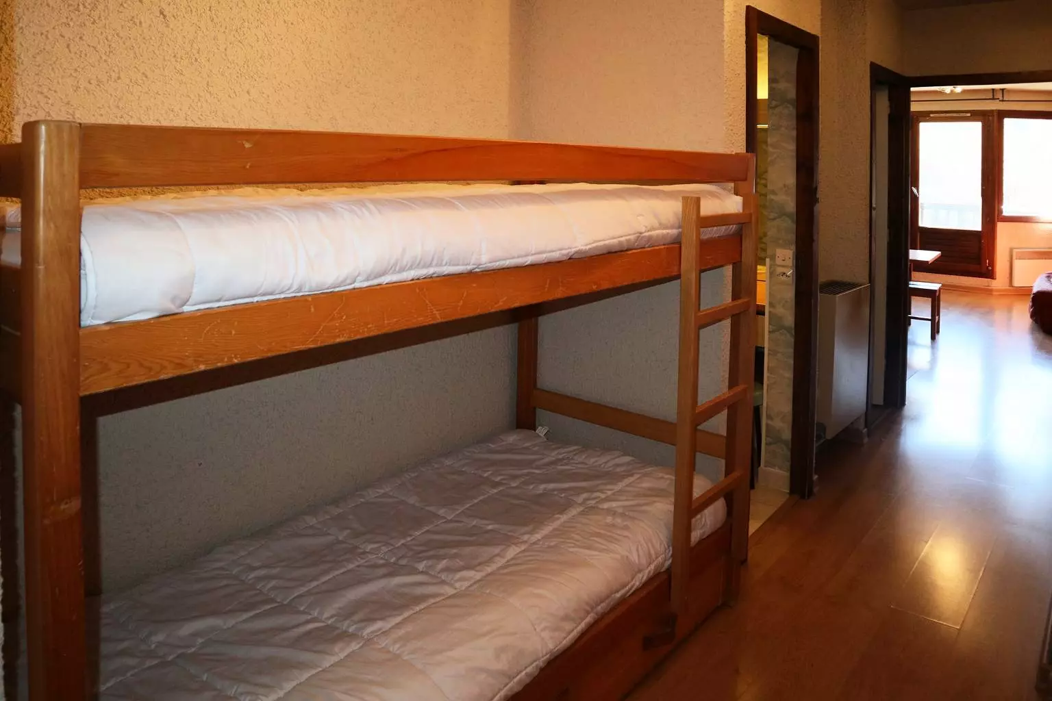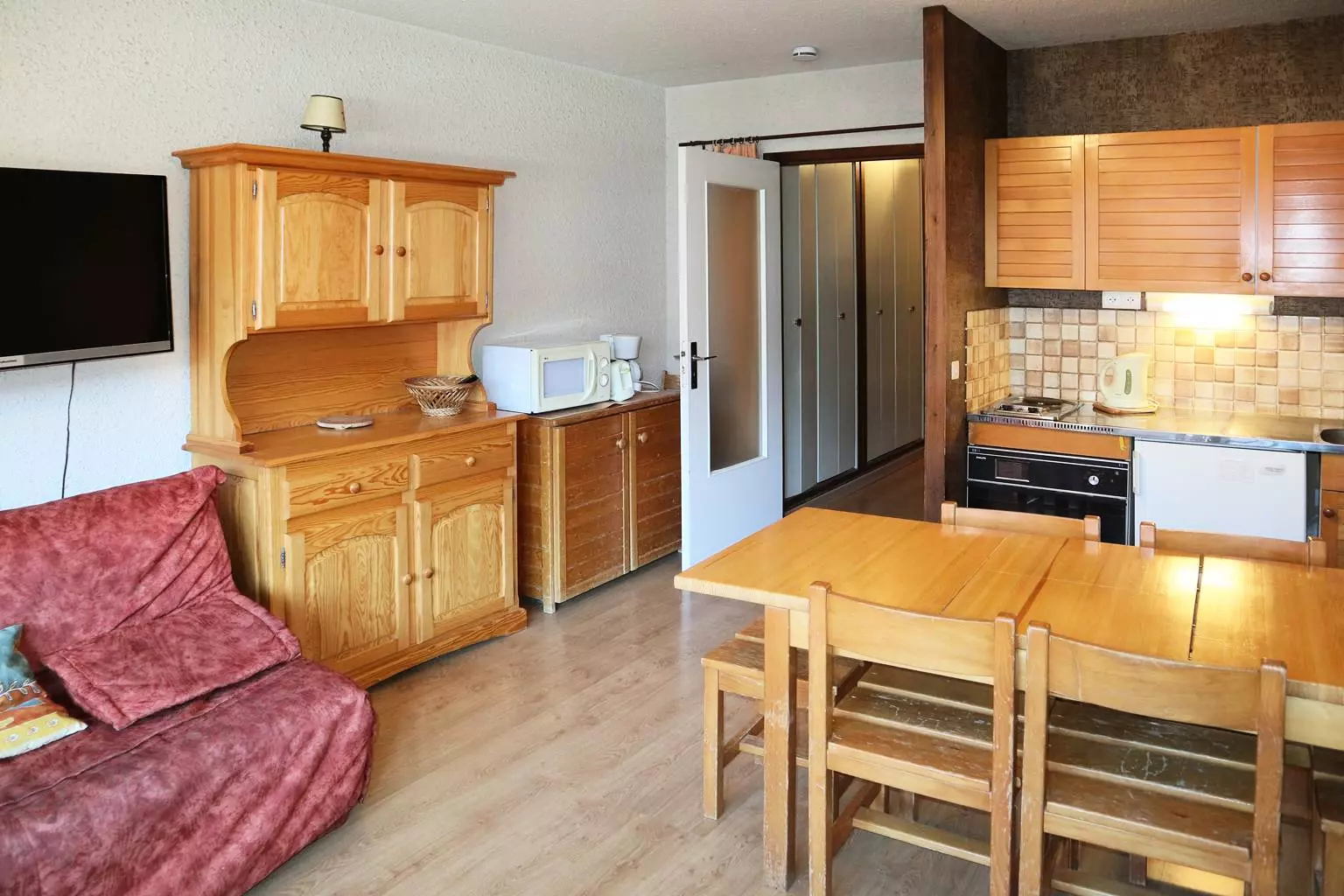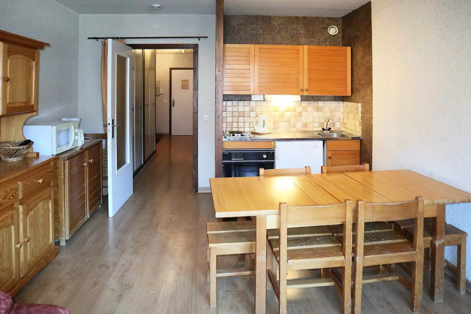 Grand studio équipé pour 6 personnes au coeur du centre de la station comprenant à l'entrée 2 lits superposés 1 place et 2 lits rabattables 1 place, un séjour avec 1 banquette BZ en 160 x 200 cm, un coin cuisine ouvert sur le séjour, une salle de bains et Wc séparés. Balcon exposition Sud au 6ème étage offrant une belle vue sur la vallée et la patinoire. Parquet au sol. Accès direct aux pistes et commerces. 6 ème étage avec ascenseur.