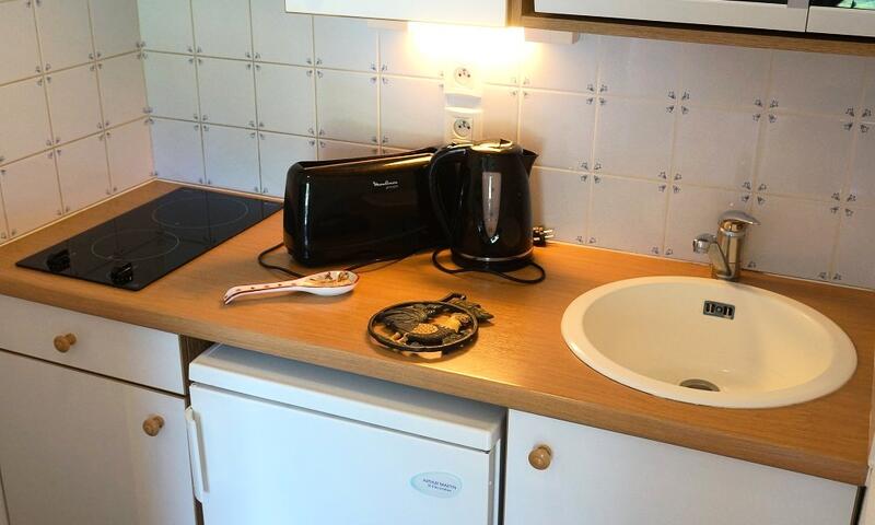 Entrée, wc séparé, salle d'eau (douche), séjour exposé est comprenant un canapé bz, living, télévision et kitchenette équipée (micro-ondes, mini four, bouilloire, cafetière électrique, grille-pain, lave-vaisselle...). une chambre avec un lit 140, chevet et armoire, une autre chambre avec deux lits superposés et commode. lave-linge.