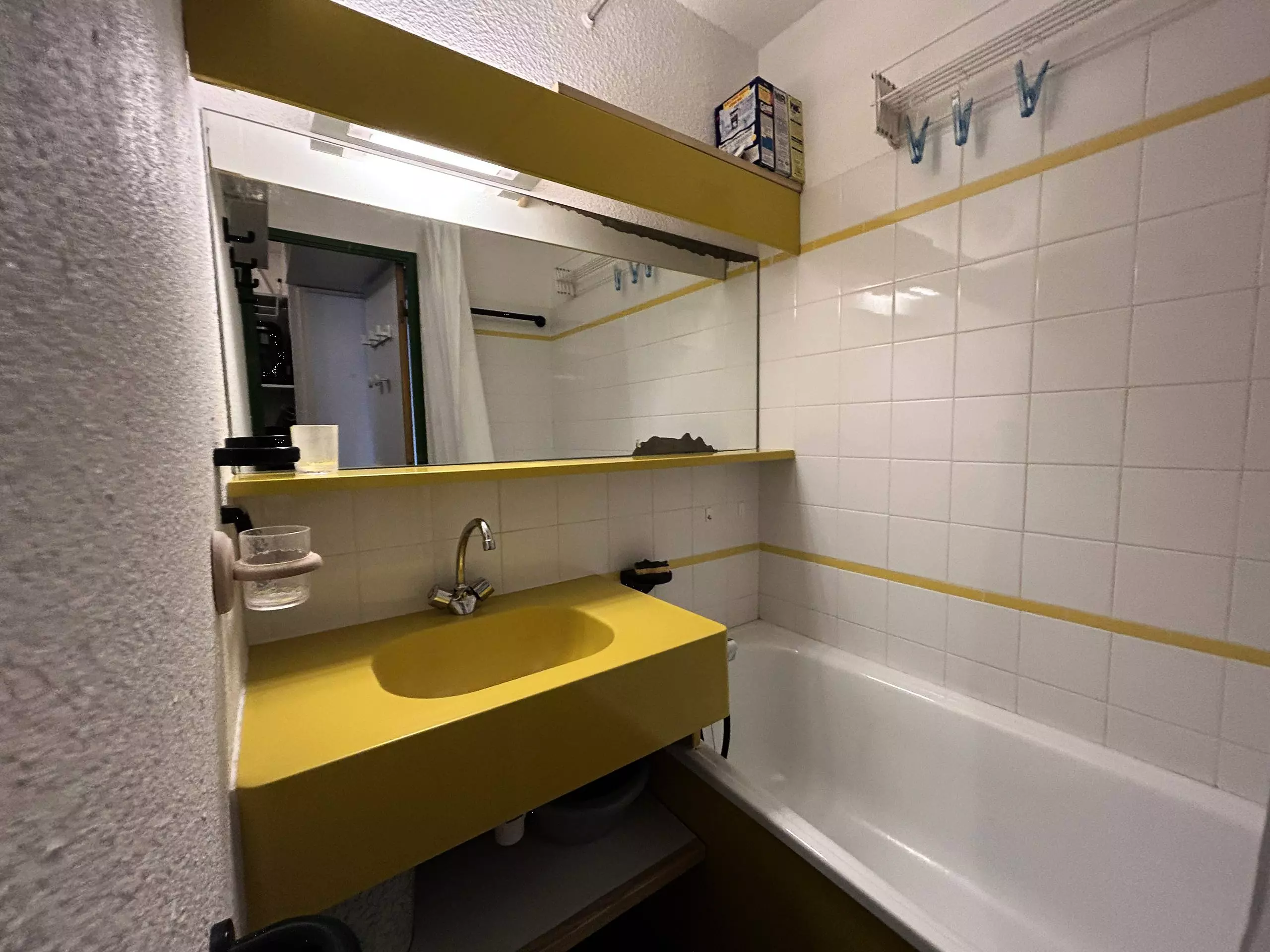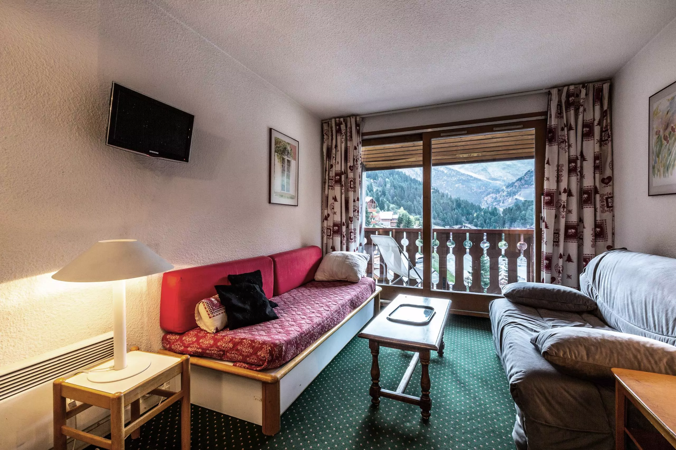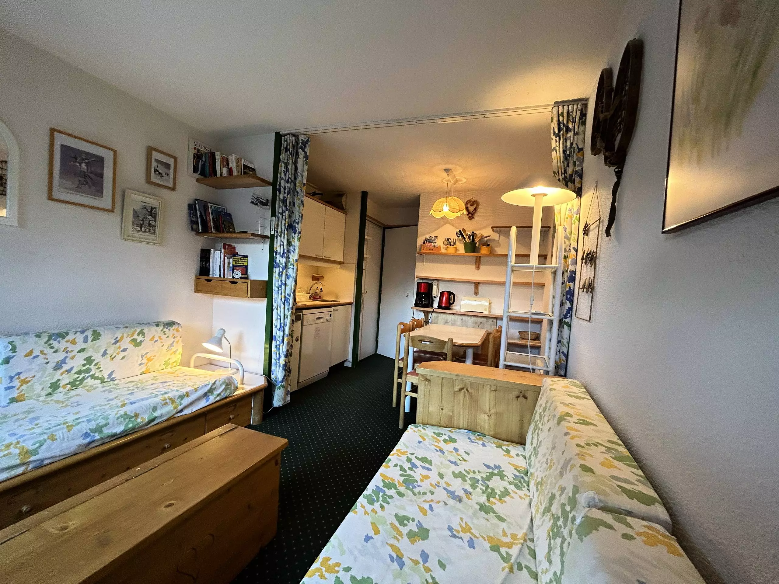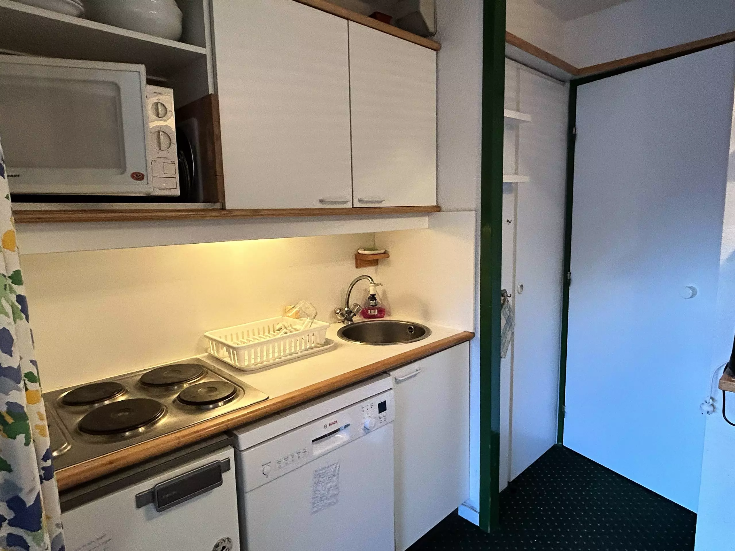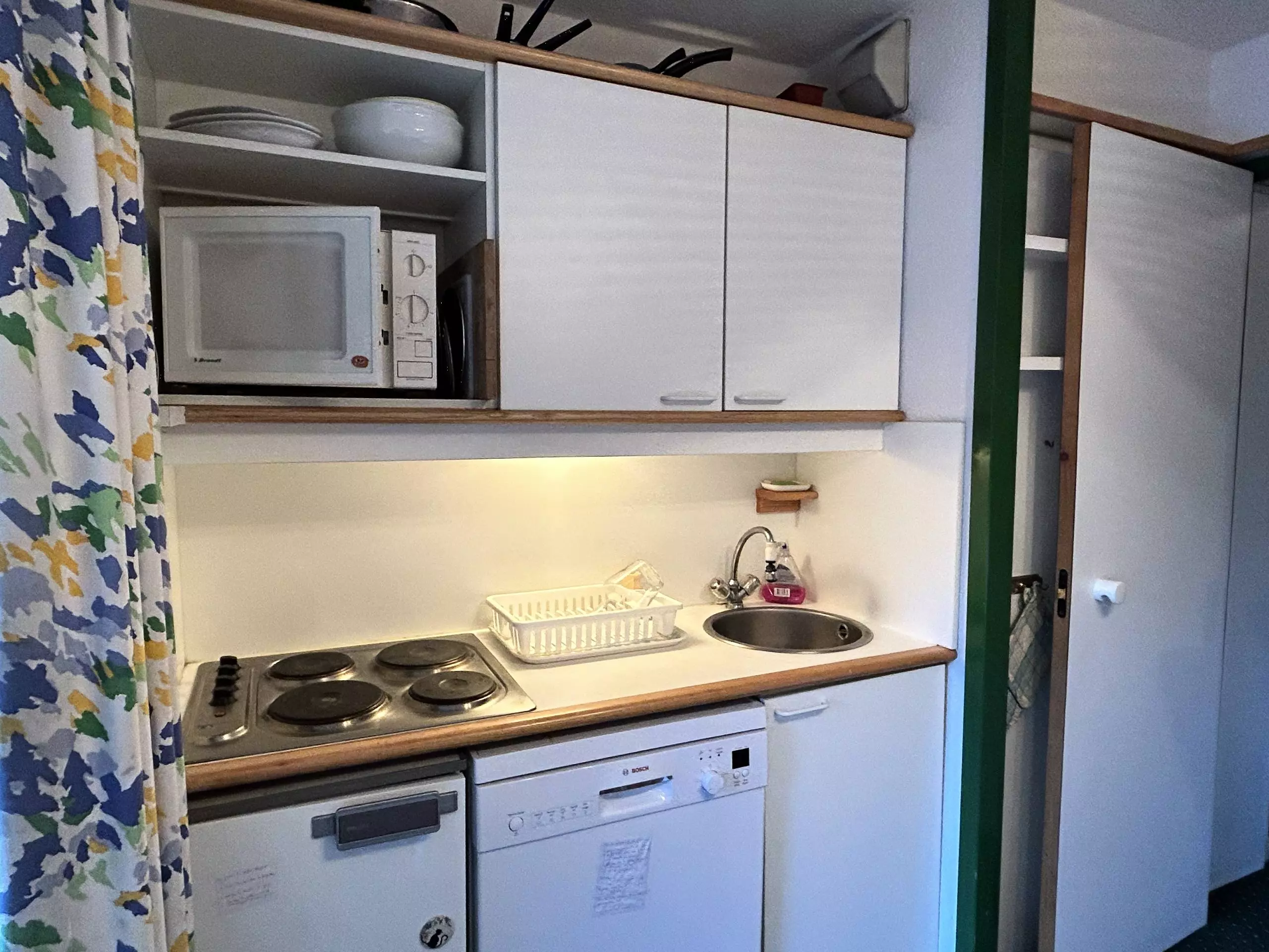 Séjour comprenant deux banquettes lits (80x190), une télévision. Cabine avec 1 lit double (2 matelas 80x190). Kitchenette équipée de plaques électriques, petit four traditionnel, micro-onde, lave-vaisselle, réfrigérateur, cafetière, grille pain et bouilloire. Salle de bains et wc séparés. Balcon. Ascenseur et casier à skis dans la résidence. 3ème étage. Appartement NON FUMEUR - Animaux non acceptés
