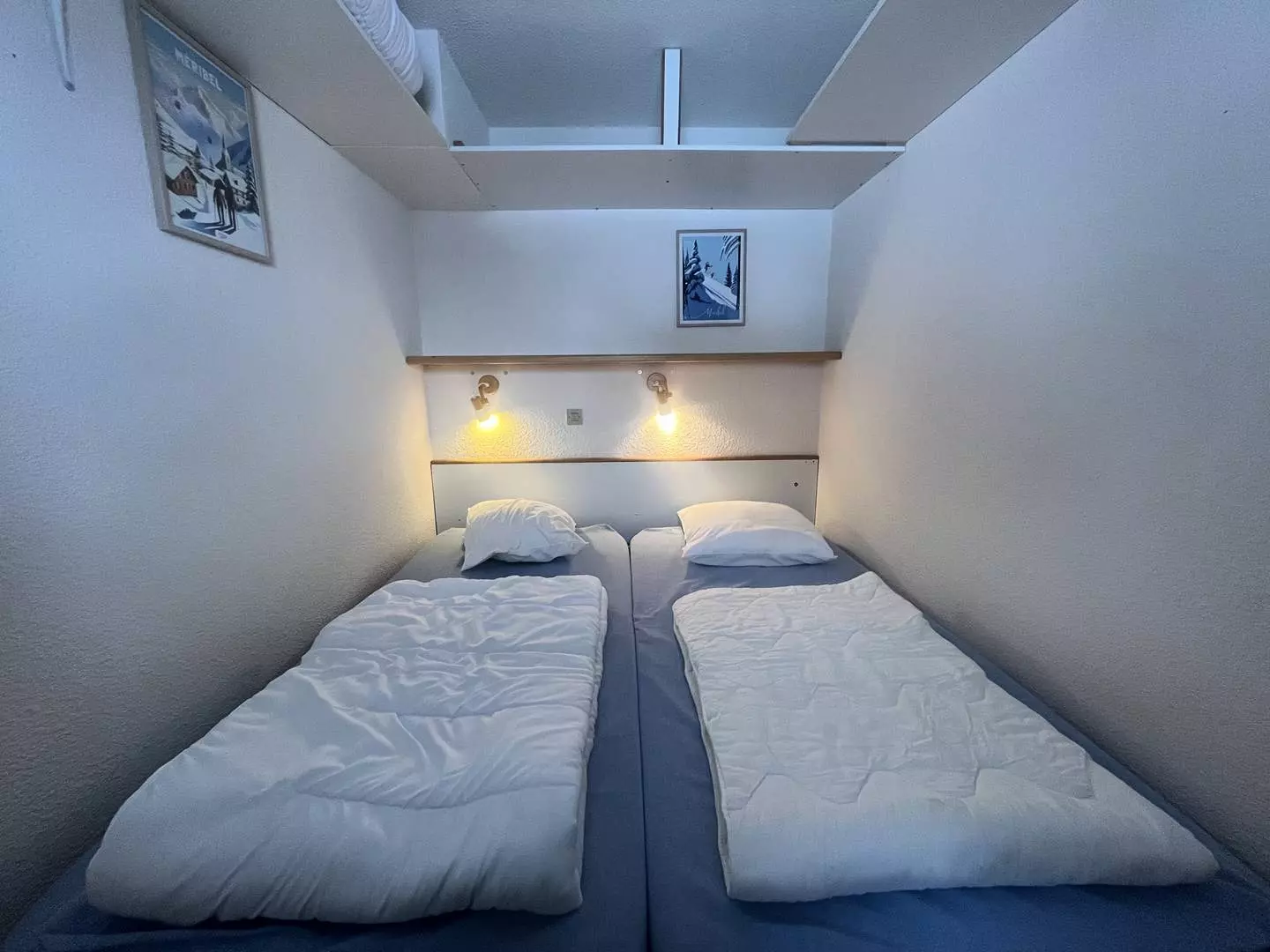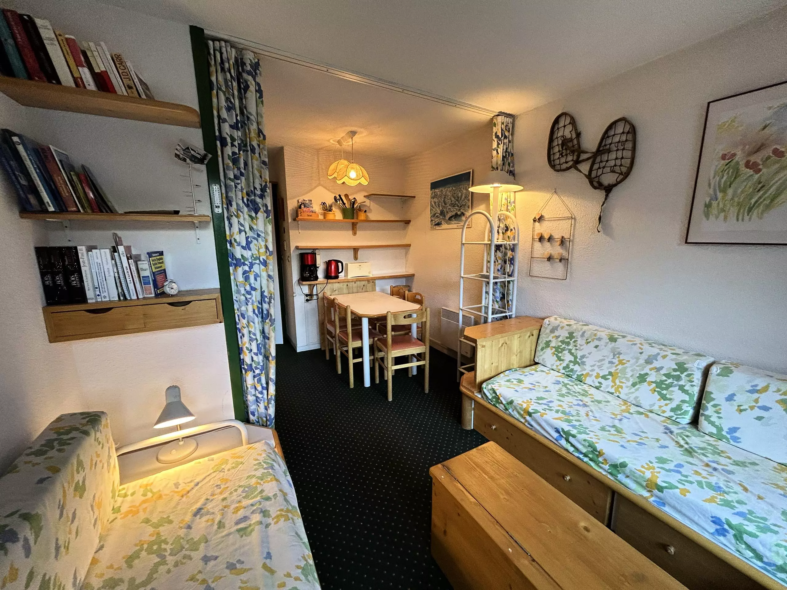Séjour comprenant deux banquettes lits et un lit gigogne (80x190), une télévision. Cabine avec lits superposés (80x190). Kitchenette équipée de plaques vitrocéramiques, four traditionnel, lave-vaisselle, réfrigérateur, cafetière et bouilloire. Salle de bains avec WC. Balcon. Ascenseur et casier à skis dans la résidence. 3ème étage.